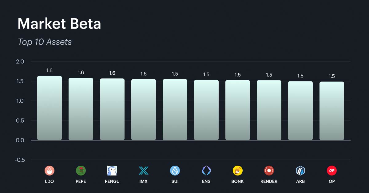 The market beta rankings remain stable for the sixth consecutive week. The high-beta cohort is unchanged: meme coins, newer layer-1 and layer-2 platforms, and DeFi infrastructure tokens continue to cluster between 1.5 and 1.6. The low-beta end is similarly persistent, anchored by WLFI at 0.7, BTC at 0.9, and a group of established protocols at or near 1.0. Six weeks of stability in these rankings through one of the most active periods of factor rotation in recent memory confirms that market beta is a structural characteristic rather than a cyclical one. For investors, the takeaway is straightforward: the names at the top of this list will continue to amplify both gains and losses regardless of which factor is leading.
