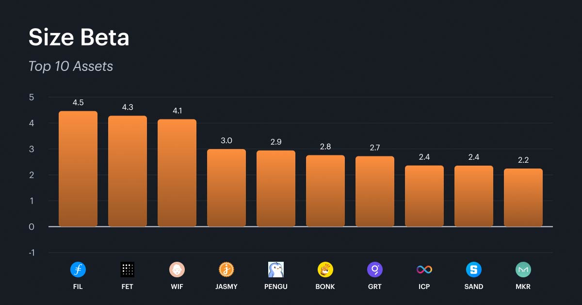Size's emergence as the second-best performing factor this week and the month-to-date leader makes this an important beta to examine. The size factor is sign-inverted, meaning higher scores are assigned to smaller-cap assets. The top 10 is dominated by meme coins and smaller-cap infrastructure tokens, the same segments that tend to exhibit the highest volatility and most speculative trading activity. These are tokens with smaller fully diluted market capitalizations relative to the broader index, and their presence at the top of the size beta rankings explains why the factor is performing well in a week where liquidity is also leading. The +0.9% weekly return for size, combined with liquidity's +1.4%, indicates that the smallest and least liquid names are outperforming together. This combination is a classic risk appetite signal: investors are reaching further down the cap spectrum and accepting thinner liquidity in exchange for potential upside. For investors, the size factor's leadership this early in April, following a -32% year-to-date market decline, could indicate either a bottoming process where small-caps lead the recovery or a final bout of speculative rotation before another leg lower. The distinction matters, and position sizing should reflect the uncertainty.