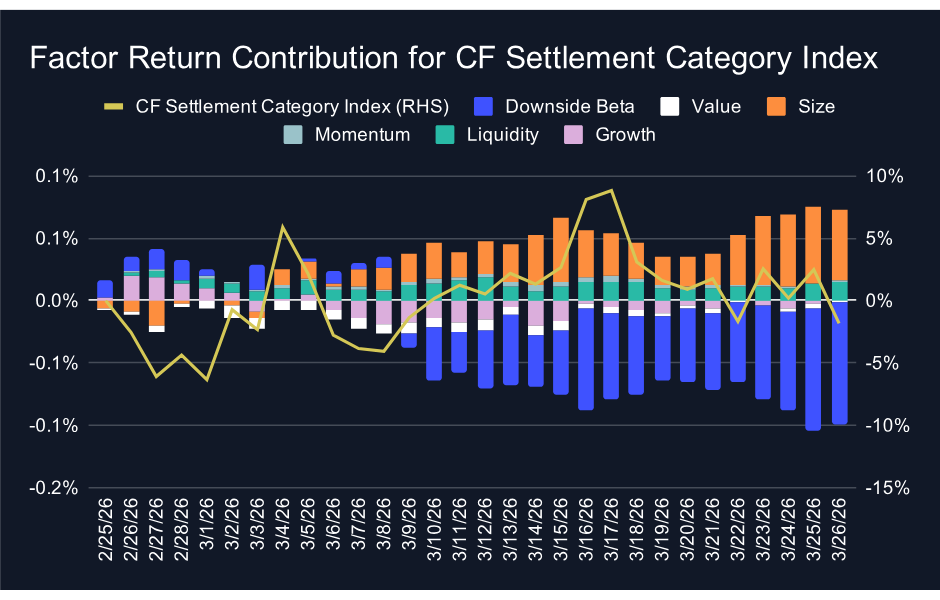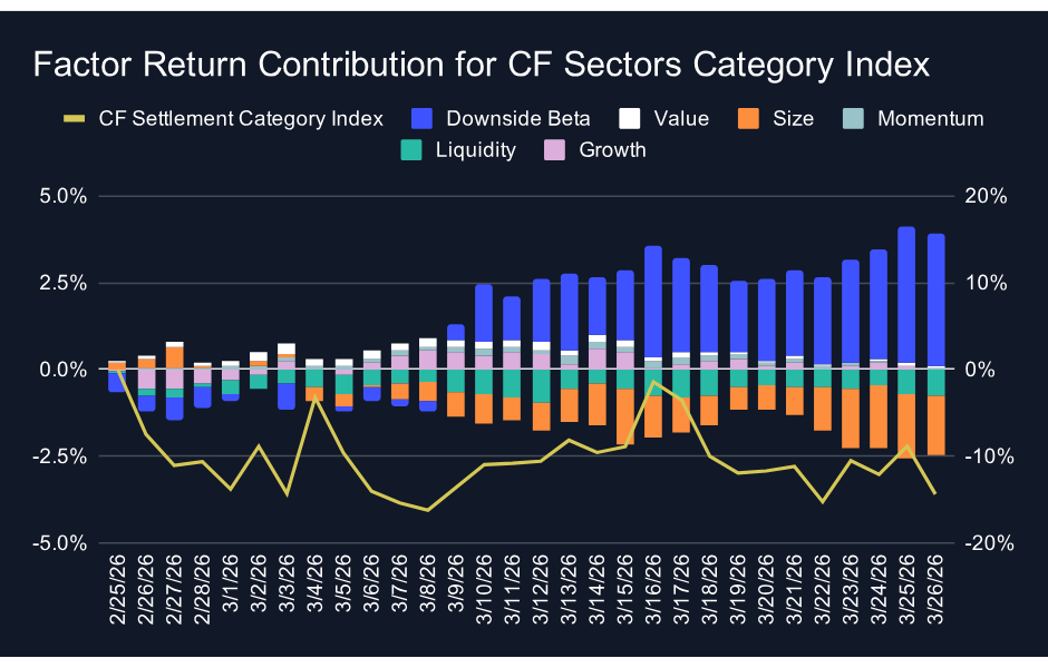 The Settlement category continues to stand apart from the other two. Factor contributions have been positive throughout the majority of the period, led by downside beta and size. The index performance line remains in positive territory, and the alignment between positive factor contributions and positive index performance gives the recovery in tokens in the Settlement category a more durable foundation than what is visible in Sectors or Services. The concentration of large-cap blue-chip tokens in Settlement continues to provide the compositional advantage that has defined this category throughout the drawdown and into the recovery. Even with this week's pullback, Settlement's factor-supported recovery remains the most structurally sound of the three categories.
