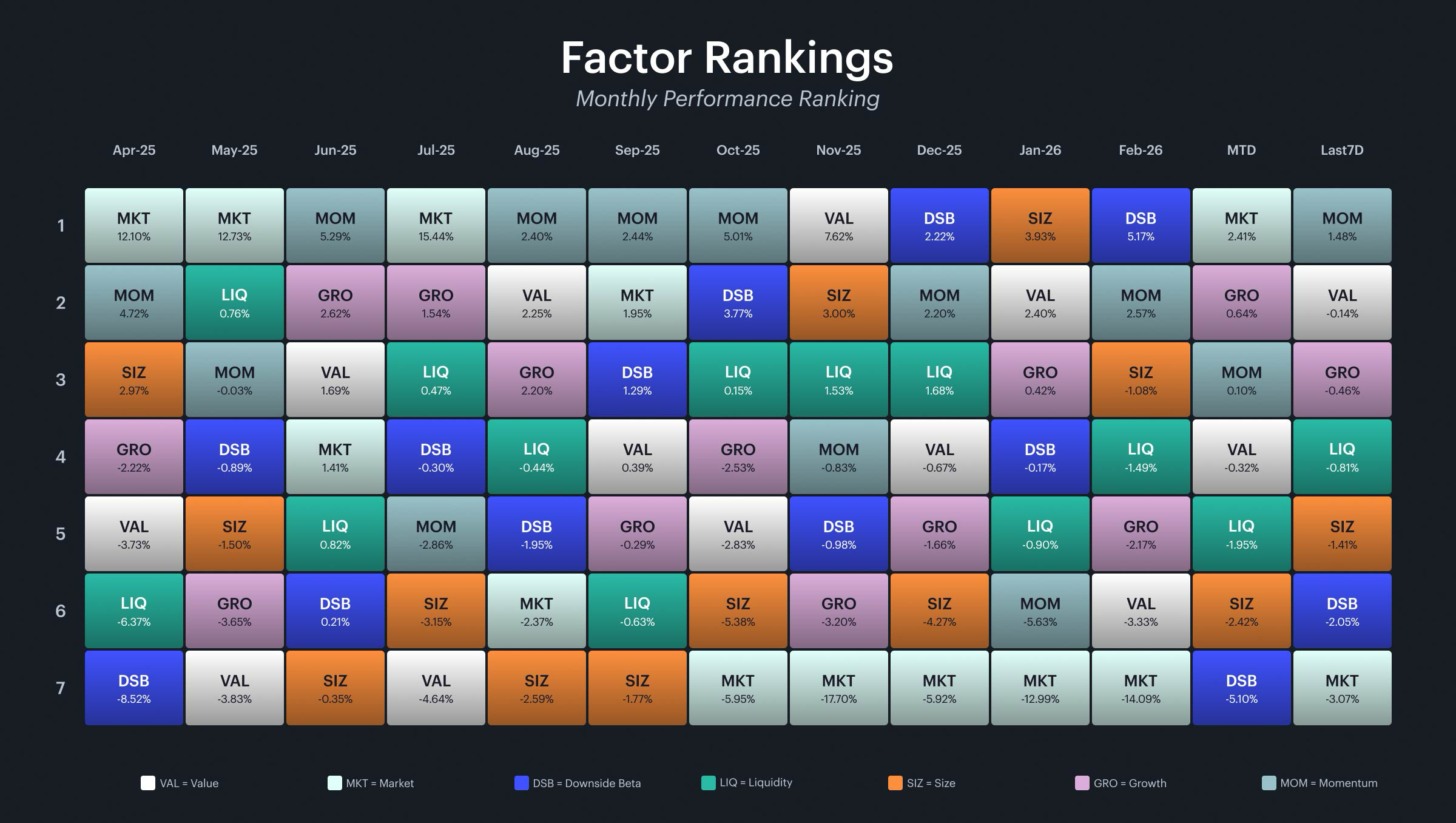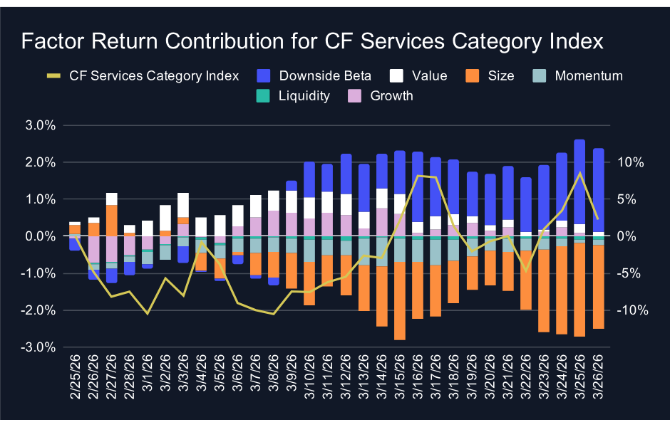 The quilt chart showcases the factor rotation. Momentum sits at the top of the weekly rankings at +1.5%, with value in second at -0.1% and growth in third at -0.5%. On a month-to-date basis, the market factor leads at +2.4%, followed by growth at +0.6%, with momentum in third at +0.1%. The progression over the past five weeks has been remarkably orderly: downside beta led in late February, value and growth took over in early March, liquidity surged to the top last week, and now momentum has claimed the weekly lead. Each transition has coincided with a different part of the market rotating into favor. The quilt also shows downside beta falling to last place in both the monthly rankings at -5.1% and second-to-last on the week at -2.1%, a stark contrast to its dominance through February. For investors, the orderly week-to-week rotation is a healthier signal than a single factor dominating repeatedly, but the market's inability to sustain gains suggests that the recovery is still fragile. The factor rotation is broadening, but it has not yet translated into a sustained directional move higher.