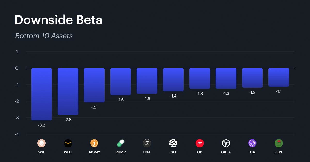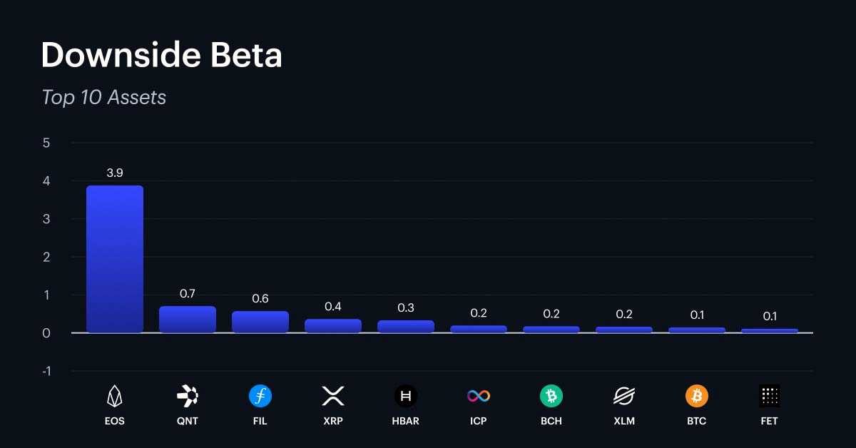 Downside beta's decline continues to be one of the defining narratives of the past month. The factor declined 2.1% on the week and 4.4% over four weeks, and now sits in last place in the month-to-date rankings at -5.1%. Its year-to-date return of +3.8% still leads all factors, but the cushion has eroded sharply from +9.2% just five weeks ago. The top 10 remains concentrated among established layer-1 infrastructure and store-of-value assets, led by EOS at 3.9, followed by QNT at 0.7, FIL at 0.6, XRP at 0.4, and HBAR at 0.3. BTC appears at 0.1, confirming its role as a defensive anchor with modest sensitivity to the factor. The bottom 10 reveals which segments of the market are least defensive and most exposed to drawdowns. Meme coins, speculative DeFi protocols, gaming tokens, and newer layer-1 platforms dominate the lowest scores - these are the names that have participated most aggressively in recent sell-offs and would be expected to lead losses in the next leg lower.