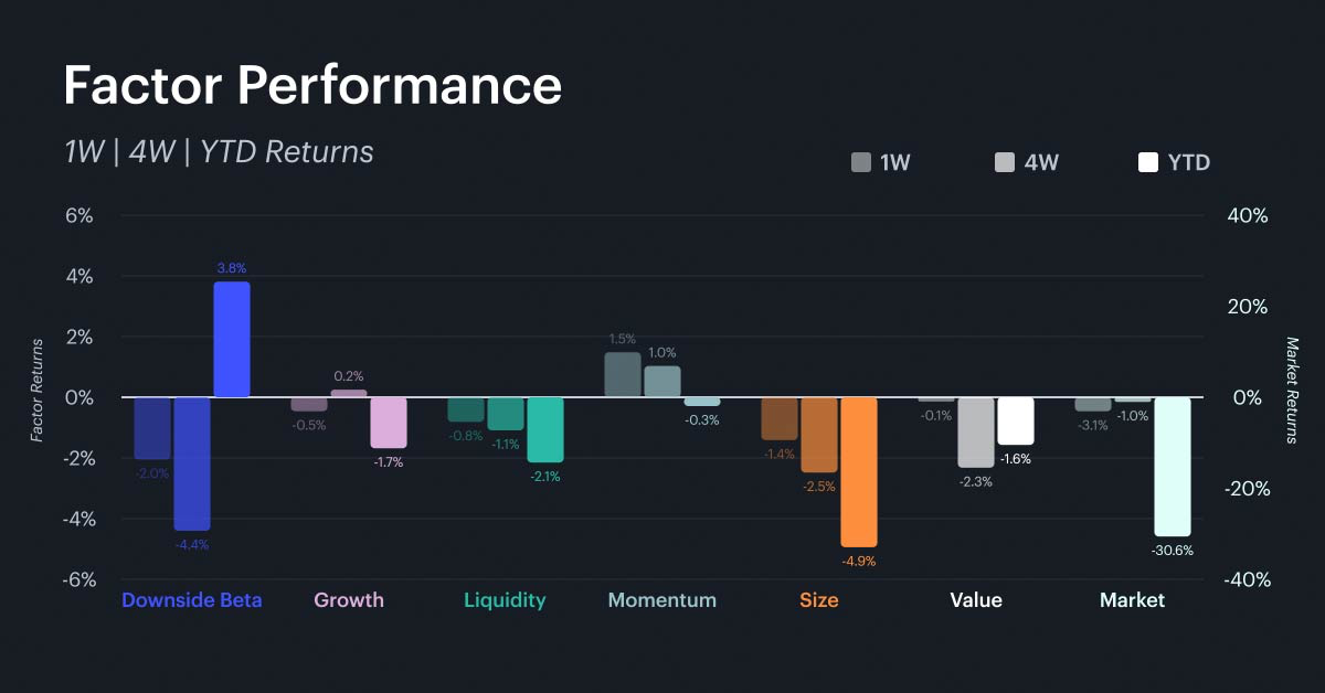 The market declined 3.1% on the week, giving back a portion of the rally that had narrowed the year-to-date drawdown over recent weeks. The year-to-date loss now stands at 30.6%. The best performer this week is momentum, which topped the weekly factor rankings for the first time this year at +1.5%, a meaningful gap over the others. Value held up relatively well at -0.1% on the week, while growth posted a modest decline of 0.5%. Downside beta fell 2.1% on the week and has now dropped 4.4% over four weeks, though it still holds the year-to-date lead at +3.8%. The market factor posted the steepest decline of the group at -3.1% on the week, extending the broad sell-off that pulled the year-to-date return to -30.6%. The rotation away from downside beta that began five weeks ago has now extended to momentum, completing a full circuit through the factor universe. This breadth of rotation is notable. Rather than a single factor reasserting dominance, each week has seen a different leader emerge. For investors, momentum's arrival at the top signals that recent winners are beginning to attract incremental capital, a dynamic that can be self-reinforcing in the short term.