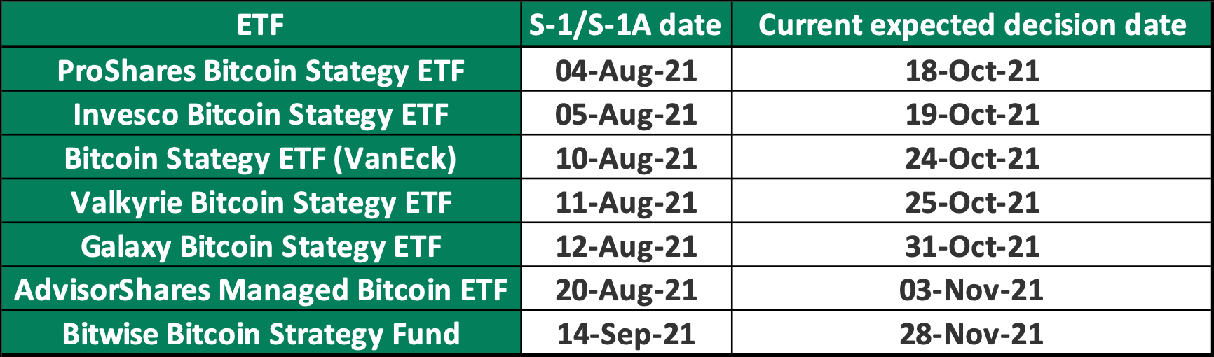 For ease of reference over the next few days and weeks, the table below summarises Bitcoin futures strategy ETF applications to the SEC registered under the ’40 Act only, extrapolating earliest dates on which the commission could publish its decisions.