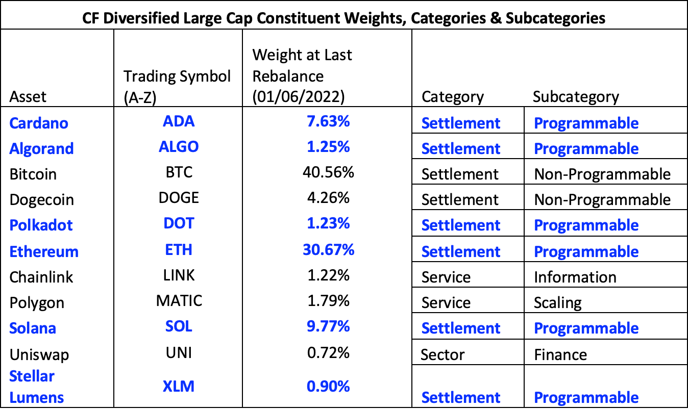 For another example, we’ve applied the structure to CF Benchmarks’ CF Diversified Large Cap Index - the regulated liquid benchmark representing 95% of the total market capitalisation of the investible digital asset universe.