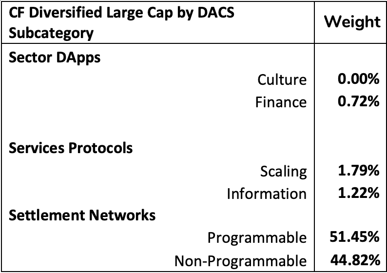 Whilst both portfolios purport to be broadly representative of the crypto market, CF DACS reveals and quantifies the precise exposure of their constituents to standardized classification categories and subcategories.