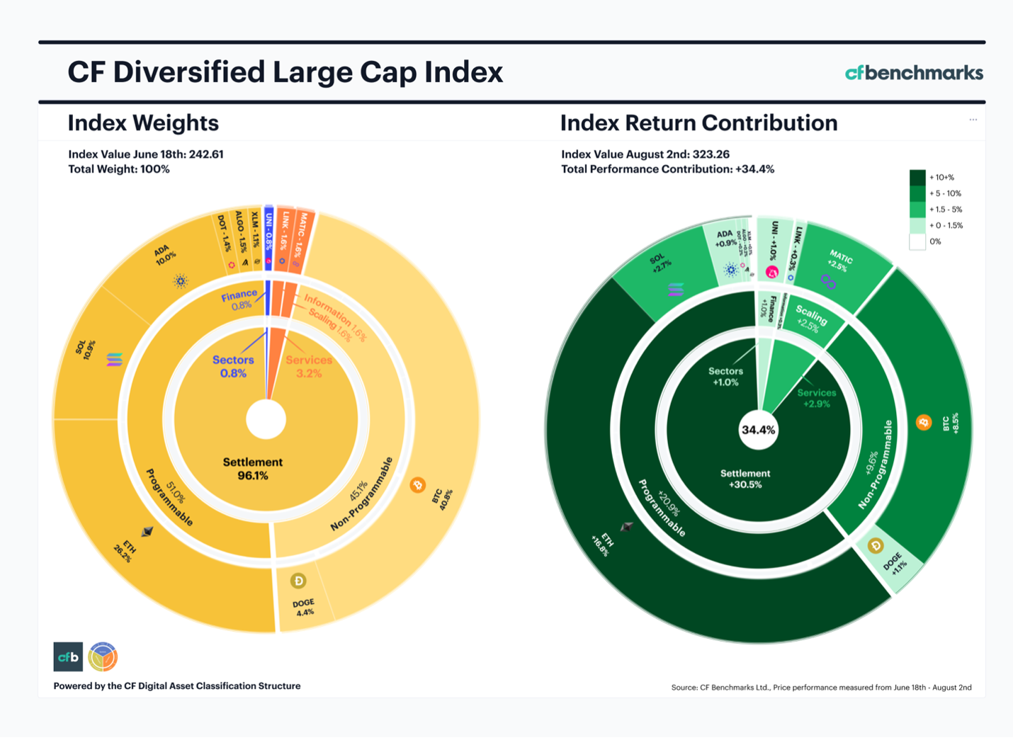 It is also worth noting that ETH’s positive price performance, has had some “spill-over” impact to its closest competitor in the programmable sub-category, Solana, which saw its +25% price appreciation contribute just over 2.7% of the total performance contribution. This also made it the third largest driver of price performance, just behind Bitcoin (+8.5%), which carries a much larger relative weight in the CF Diversified Large Cap Index.