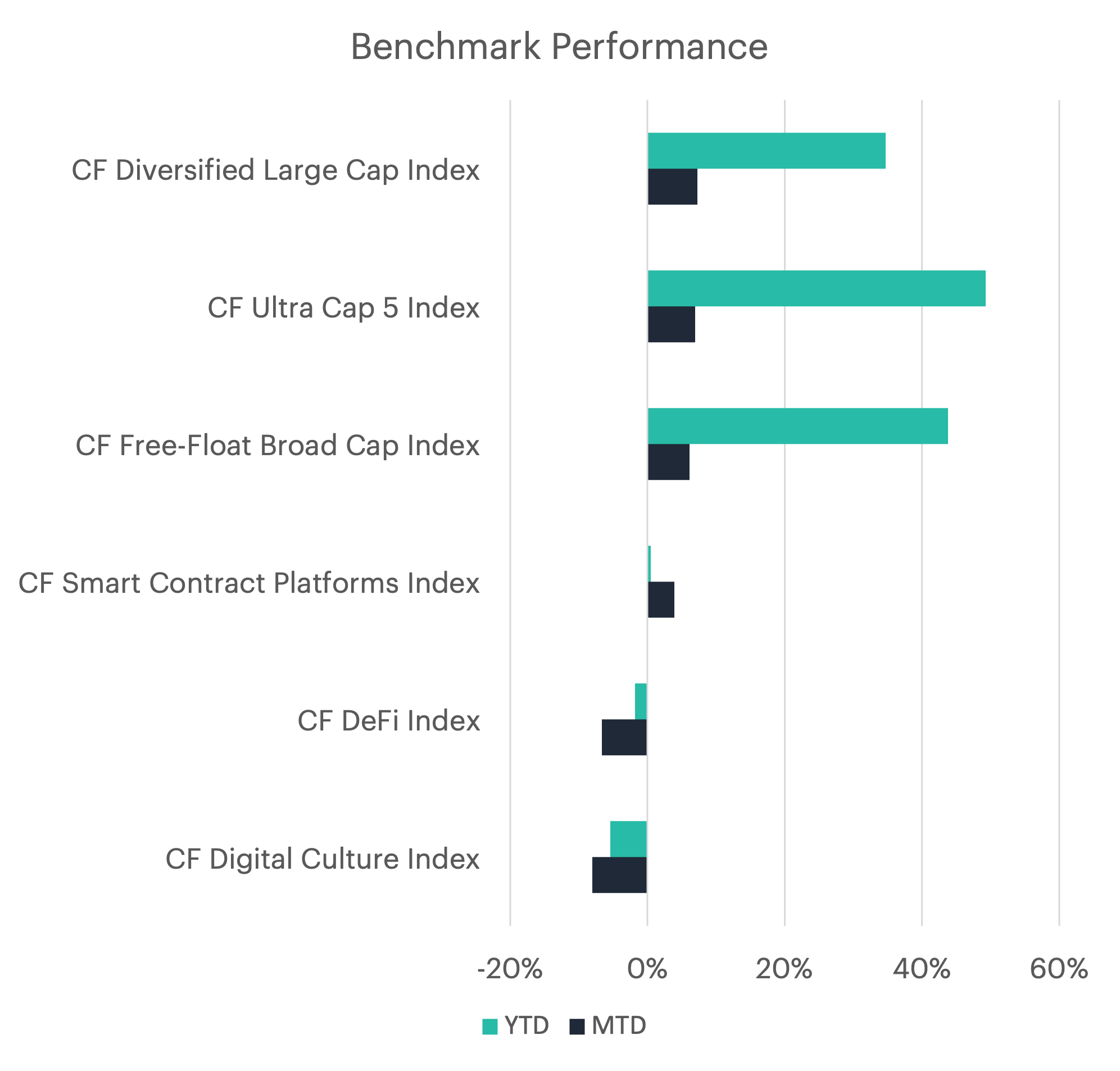 • Index Gains and Sectoral Shifts: Last month's portfolio index performance was broadly positive. The CF Free-Float Broad Cap Index, our broadest gauge of the institutionally investible market, recorded a 6.1% gain. Mega-cap tokens, represented by the CF Ultra Cap 5 Index, emerged as top performers, rising by 6.7%. The CF Diversified Large Cap Index led the pack with a 7.7% increase. In contrast, the CF Digital Culture Index continued to face challenges, declining by 6.7%, while the CF Blockchain Infrastructure Index lagged the rest with an 8.3% decline.
