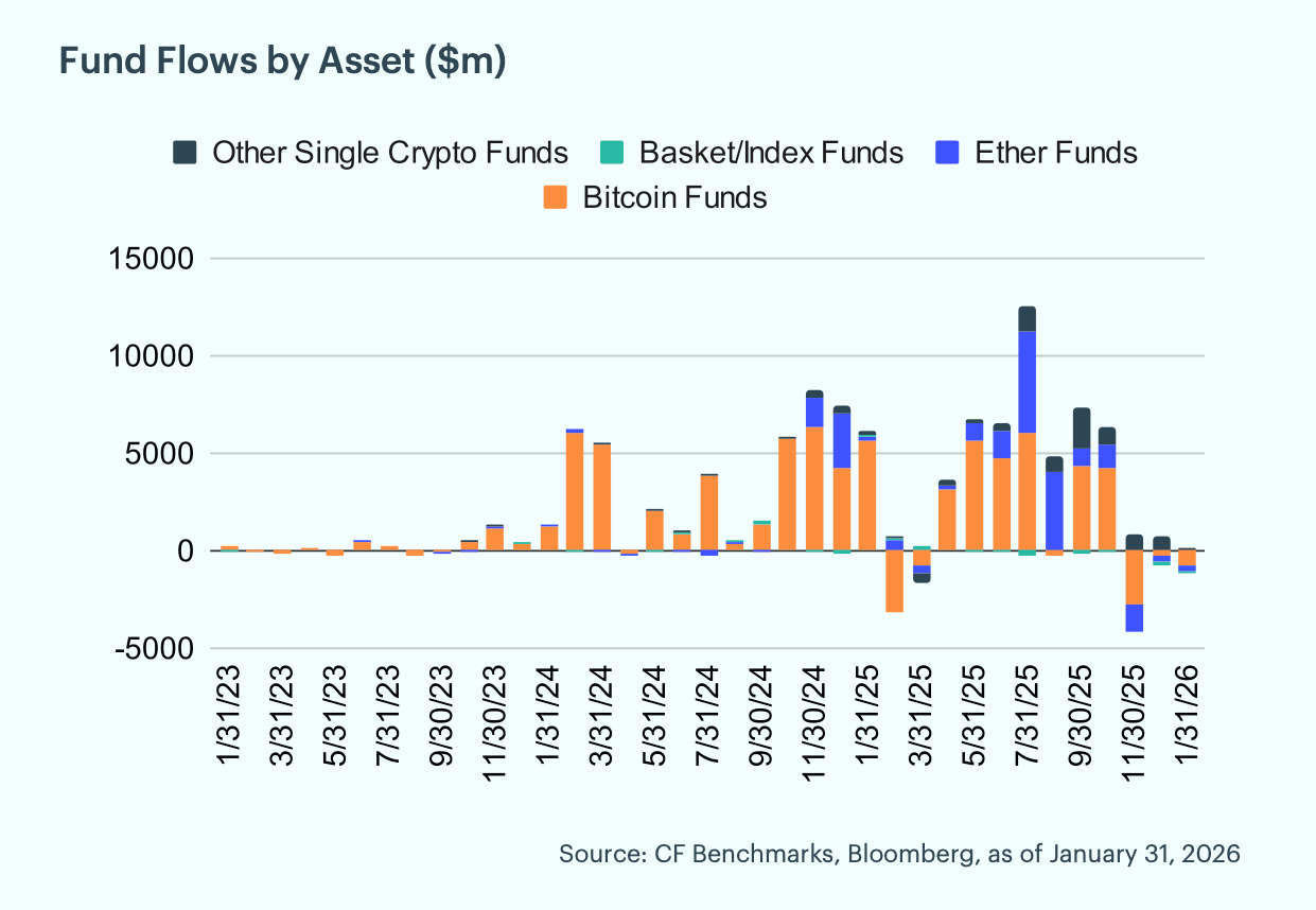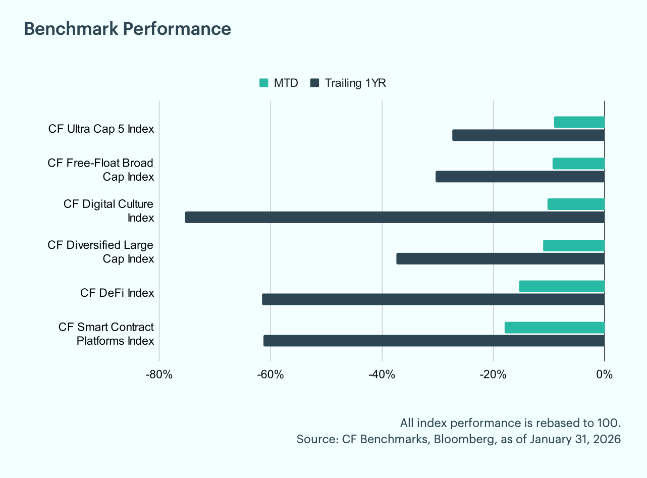 The year kicked off with heightened macro and geopolitical uncertainty that weighed on digital asset risk appetite. While the Federal Reserve held rates steady, attention quickly shifted to leadership risk as President Trump announced Kevin Warsh as the next Fed chair, which introduced uncertainty around the the potential for future rate cuts and the central bank's reaction function. Bitcoin traded defensively, consolidating near the lower end of its recent range before continuing to sell off into month-end. Regulatory momentum slowed at the margin as crypto legislation stalled out, and geopolitical tensions further dampened sentiment, reinforcing a risk-off posture. With policy clarity delayed and macro data distorted by geopolitical and seasonal effects, investors de-risked, liquidity thinned, and conviction remained low across higher-beta tokens as markets awaited clearer signals on monetary and regulatory direction.