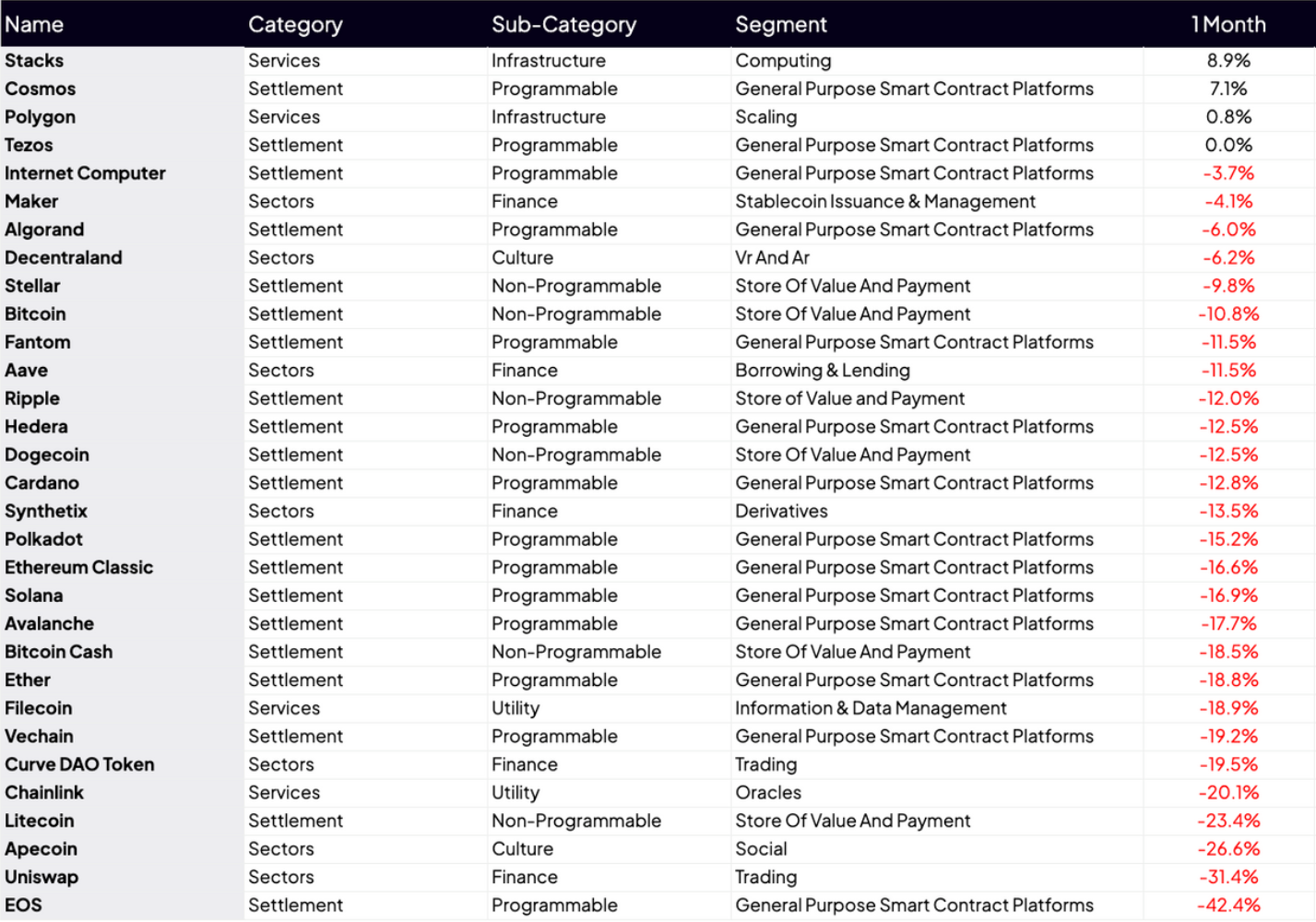 Individual Movers: Stacks (STX) led January's major crypto performers with an 8.9% gain, driven by an early-month Bitcoin Layer-2 rally and hints of institutional adoption. Cosmos (ATOM) followed at +7.1%, lifted by critical tokenomics reform proposals ahead of the mid-month deadline. Polygon (POL) held resilient with +0.8%, supported by soaring transaction volume and AggLayer unification progress. EOS trailed January's majors with a -42.4% plunge, hit by persistent ecosystem stagnation and zero meaningful updates. Uniswap (UNI) followed at -31.4%, pressured by collapsing DEX volumes in risk-off conditions. Apecoin (APE) rounded out the laggards with -26.6%, suffering ongoing NFT/metaverse apathy.