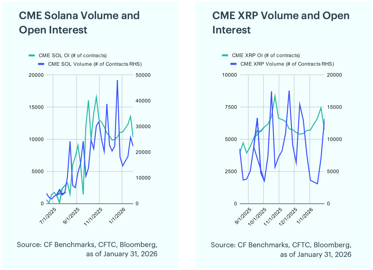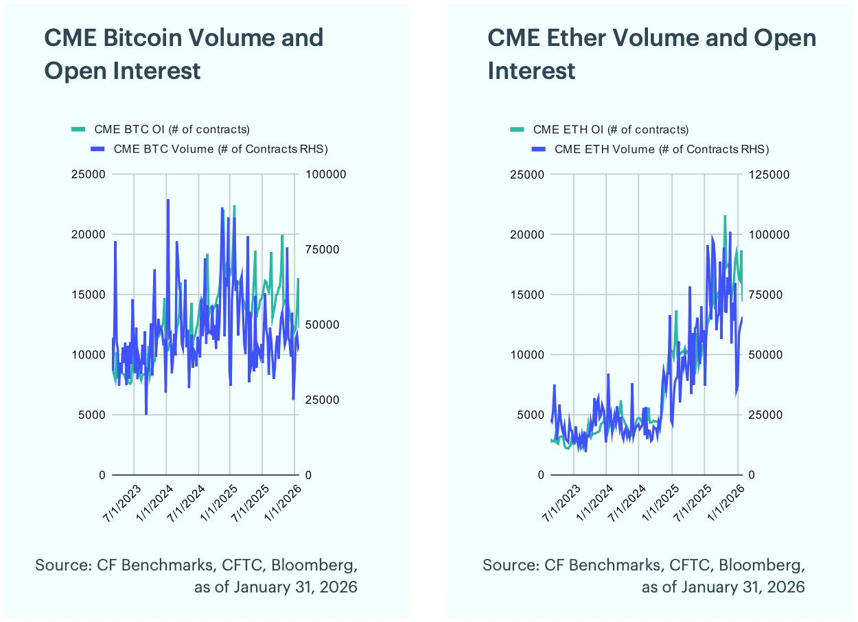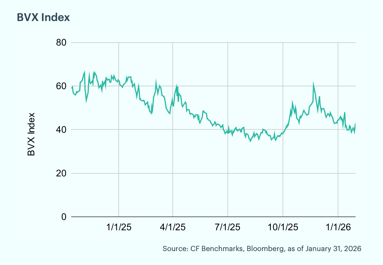 Bitcoin Volatility Continues to Compress: The CF Bitcoin Volatility Index Settlement Rate (BVXS) is a daily benchmark that provides a forward-looking, 30-day constant-maturity measure of implied volatility, derived from CFTC-regulated Bitcoin option contracts traded on the CME. The BVX reflects the fair strike of a variance swap. Over the past month, the BVX ranged between 38.82 and 47.89. During this period, volatility declined significantly, with the BVX recording a -2.1 sigma move (based on our rolling 30-day z-score) mid-month before moderating to close January at 42.94.