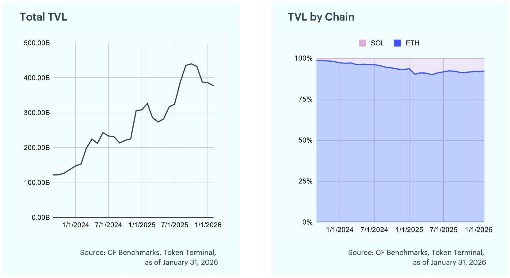 DeFi TVL Slips: Total Value Locked (TVL) measures the U.S. dollar value of assets deposited across DeFi protocols and is a core gauge of the sector’s health. Over the past month, DeFi TVL fell 2.3% to roughly $377 billion, driven by modest outflows from both Ethereum and Solana amid a broader risk-off backdrop. Solana led the decline (-4.6%), outpacing Ethereum’s pullback (-2.1%), in line with higher-beta underperformance.