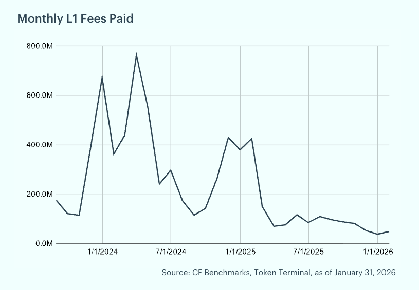 Layer-1 Fees Jump, Solana Dominates: Fees are the charges users pay to record transactions and data on a blockchain and act as a gauge for demand to use these networks. They tend to rise when there is an influx of new users on-chain and can fall when activity wanes or scaling upgrades reduce costs. In January, aggregate layer-1 fees across Bitcoin, Ethereum, and Solana rose to $48.2 million, from $37.2 million in December. Solana led with a 59.9% share, Ethereum accounted for 25.5%, and Bitcoin contributed 14.3%.