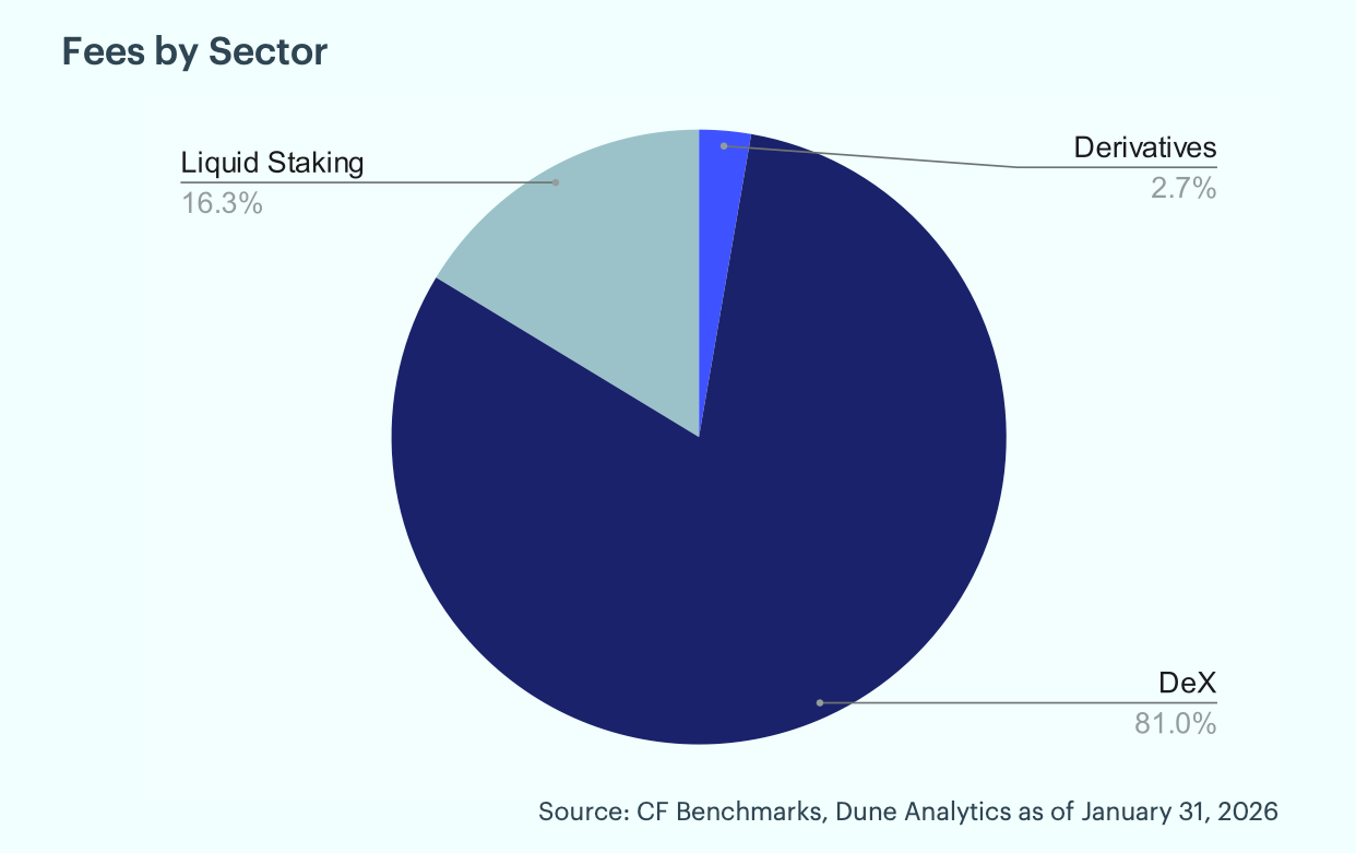 DEXs Drive Fee Surge: Breaking down Solana’s fee revenue by sector highlights which applications are driving network usage and value capture. In January, Solana layer-1 fees jumped 59.7% to $28.9 million (up from $18.1 million). Decentralized exchanges dominated, generating 81.0% of fees, while liquid staking and derivatives contributed 16.3% and 2.7%, respectively.