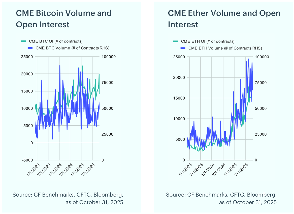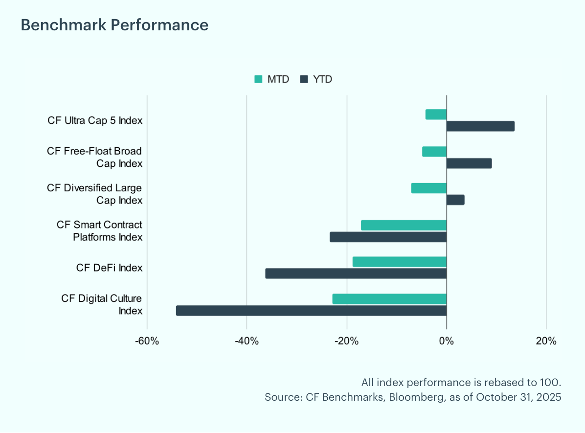 Risk-Off Rotation: However, product breadth and incremental monetary easing failed to reinforce confidence. The Fed Chair's post-meeting remarks dampened sentiment and boosted market volatility, leading digital assets lower in October with broad declines and a renewed tilt toward defensiveness. The CF Ultra Cap 5 Index fell 4.19% for the month but remains up 13.64% YTD. The CF Free-Float Broad Cap Index slipped 4.87% (+9.13% YTD), and the CF Diversified Large Cap Index declined 7.15% (+3.62% YTD). Higher-beta cohorts led the drawdown: the CF Smart Contract Platforms Index dropped 17.09% (−23.38% YTD), the CF DeFi Index fell 18.82% (−36.31% YTD), and the CF Digital Culture Index plunged 22.92% (−54.21% YTD). Overall, mega-caps proved relatively resilient while riskier segments materially underperformed.