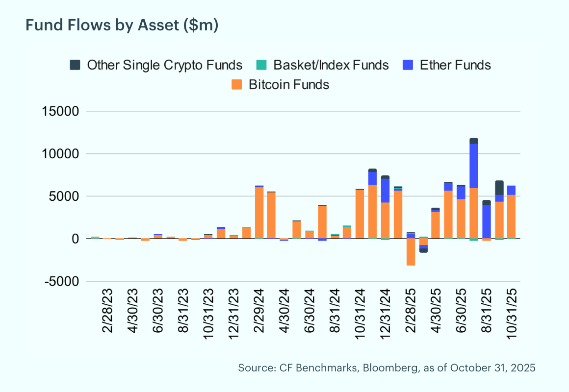 October 2025 was defined by another wave of new product access and easing policy. The SEC's recently released generic listing standards green-lit new U.S. spot ETFs beyond BTC and ETH, headlined by Bitwise's Solana staking ETF, which gathered over $400M in fund flows in the first five days of trading. CME launched options on Solana and XRP futures, expanding tools for hedging and directional strategies. The FOMC delivered a 25 bp cut to 3.75–4.00% and signaled a tapering of quantitative tightening, modestly easing financial conditions. Fund flows set early-month records, then turned choppy before firming into month-end as investors rotated across BTC, ETH and SOL-related ETPs.