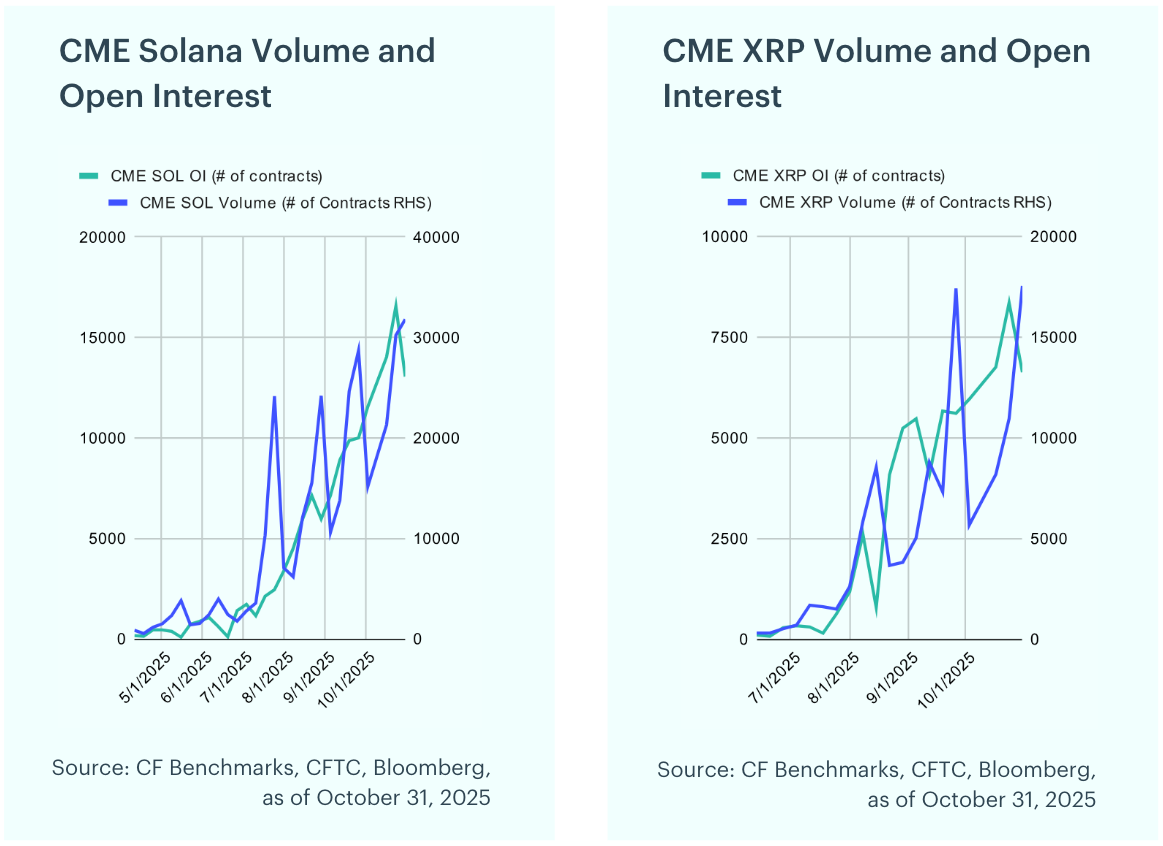 Alt-Futures Activity Surge: Bitcoin futures saw a slight decrease in open interest in September, falling 5.7% from 15,014 to 14,157 contracts. Ether futures also gained momentum, with open interest climbing 14.5% to a record 17,281 contracts, supported by robust trading activity that peaked at 88,733 contracts at month-end. Meanwhile, Solana and XRP futures posted substantial expansion amid heightened investor interest: Solana’s open interest surged 30.5% to 13,053 contracts, with volumes exceeding 31,000 contracts, while XRP’s open interest jumped 18.1% to 6,628 contracts, accompanied by a material increase in trading volumes.