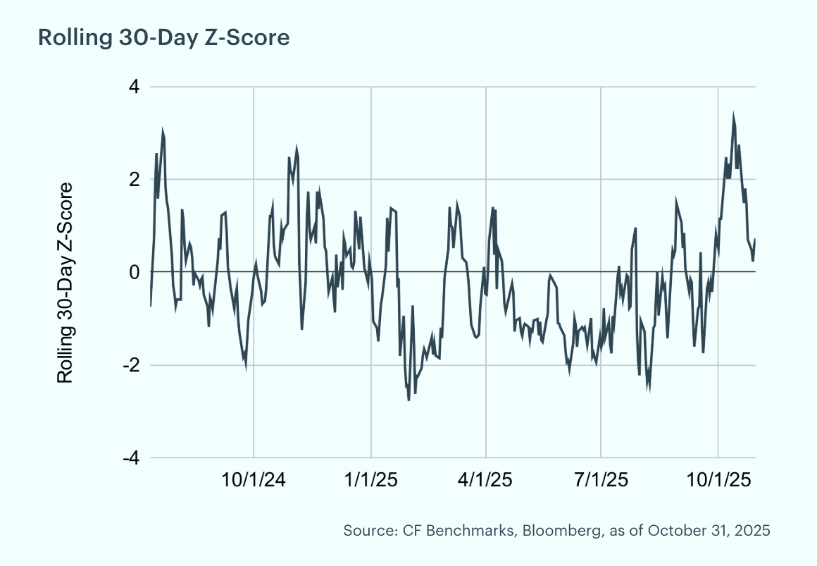 BVX Records 3.2 Sigma Mid-Month Spike: The CF Bitcoin Volatility Index Settlement Rate (BVXS) is a daily benchmark that provides a forward-looking, 30-day constant-maturity measure of implied volatility, derived from CFTC-regulated Bitcoin option contracts traded on the CME. The BVX reflects the fair strike of a variance swap. Over the past month, the BVX ranged between 38.1 and 52.0. During this period, volatility increased materially, with the BVX recording a 3.2 sigma move (based on our rolling 30-day z-score) around mid-month.