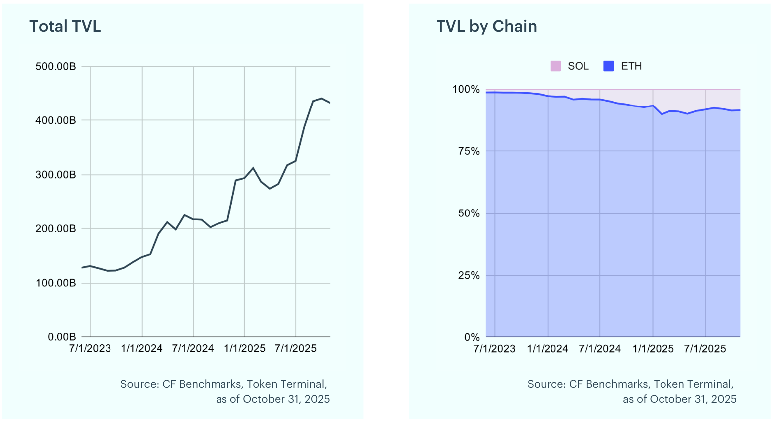 Total Value Locked Slips: Total Value Locked (TVL) in decentralized finance (DeFi) represents the aggregate value of assets deposited across DeFi protocols, expressed in U.S. dollars. It serves as a key indicator of the sector’s overall health and growth. Over the past month, total DeFi TVL declined by 1.9% to approximately $432 billion, as growth stalled amid pullbacks in Ether and Solana following their recent rallies.
