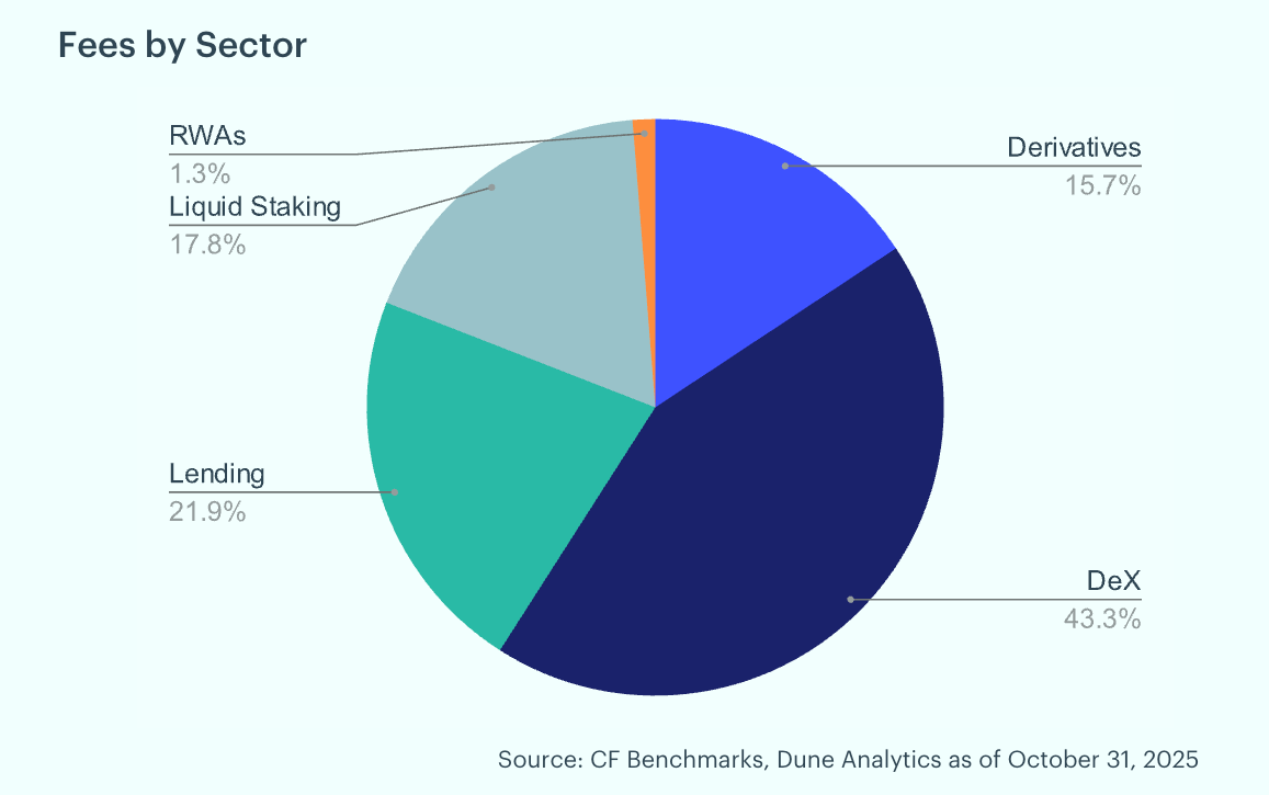 ETH Fees Up 15.3% as DEX Activity Commands 43% Share: Analyzing Ethereum’s total fees and their sector composition provides insight into the use cases driving network revenue. Ethereum layer-1 fees rose 15.3% month-over-month, increasing to $41.1 million in October from $35.9 million in September. Decentralized exchanges accounted for the largest share at 43.3%, followed by lending protocols at 21.9% and liquid staking at 17.8%. Derivatives contributed 15.7%, while real-world asset tokenization represented just 1.3%, underscoring the continued dominance of DEX activity in network fee generation.