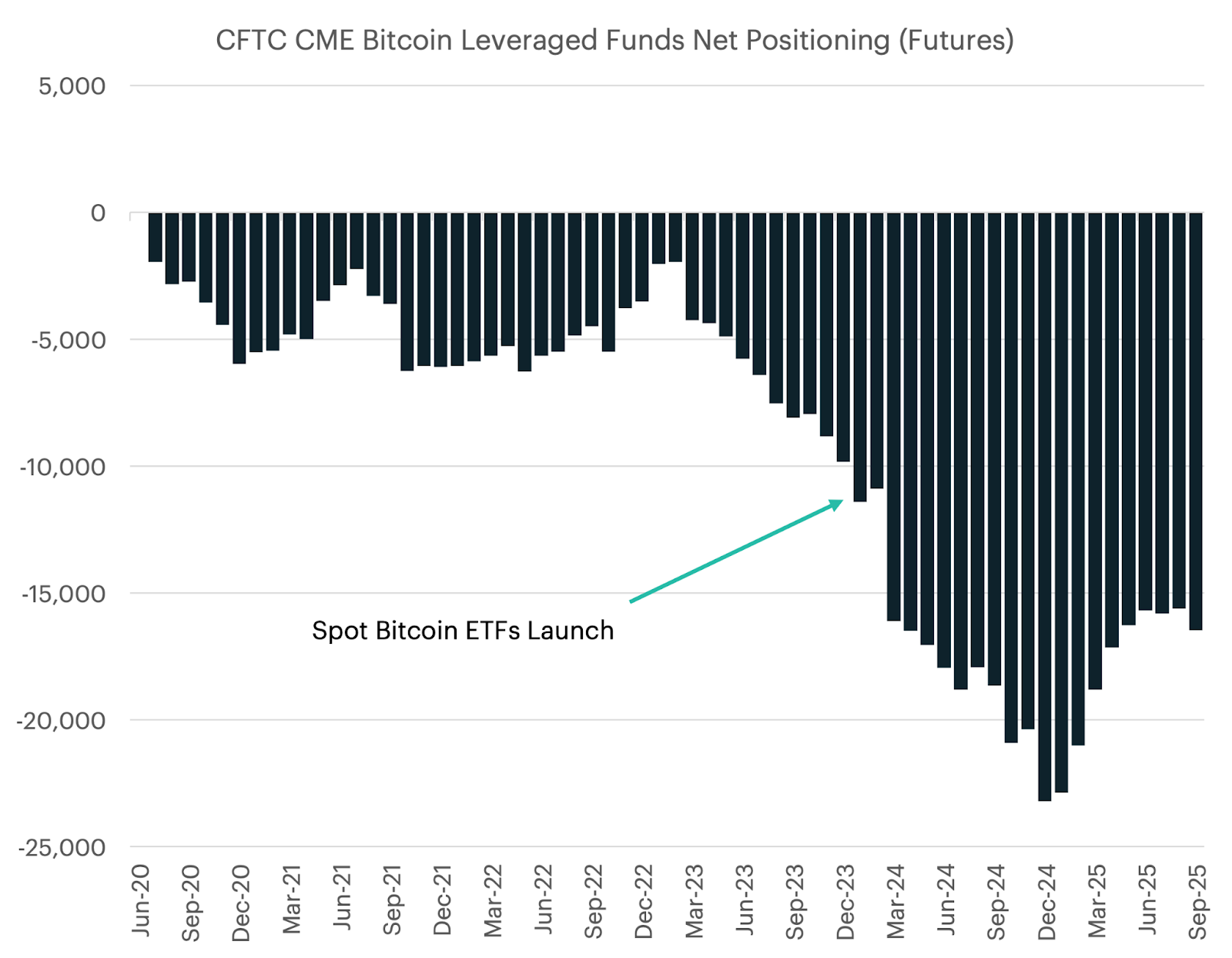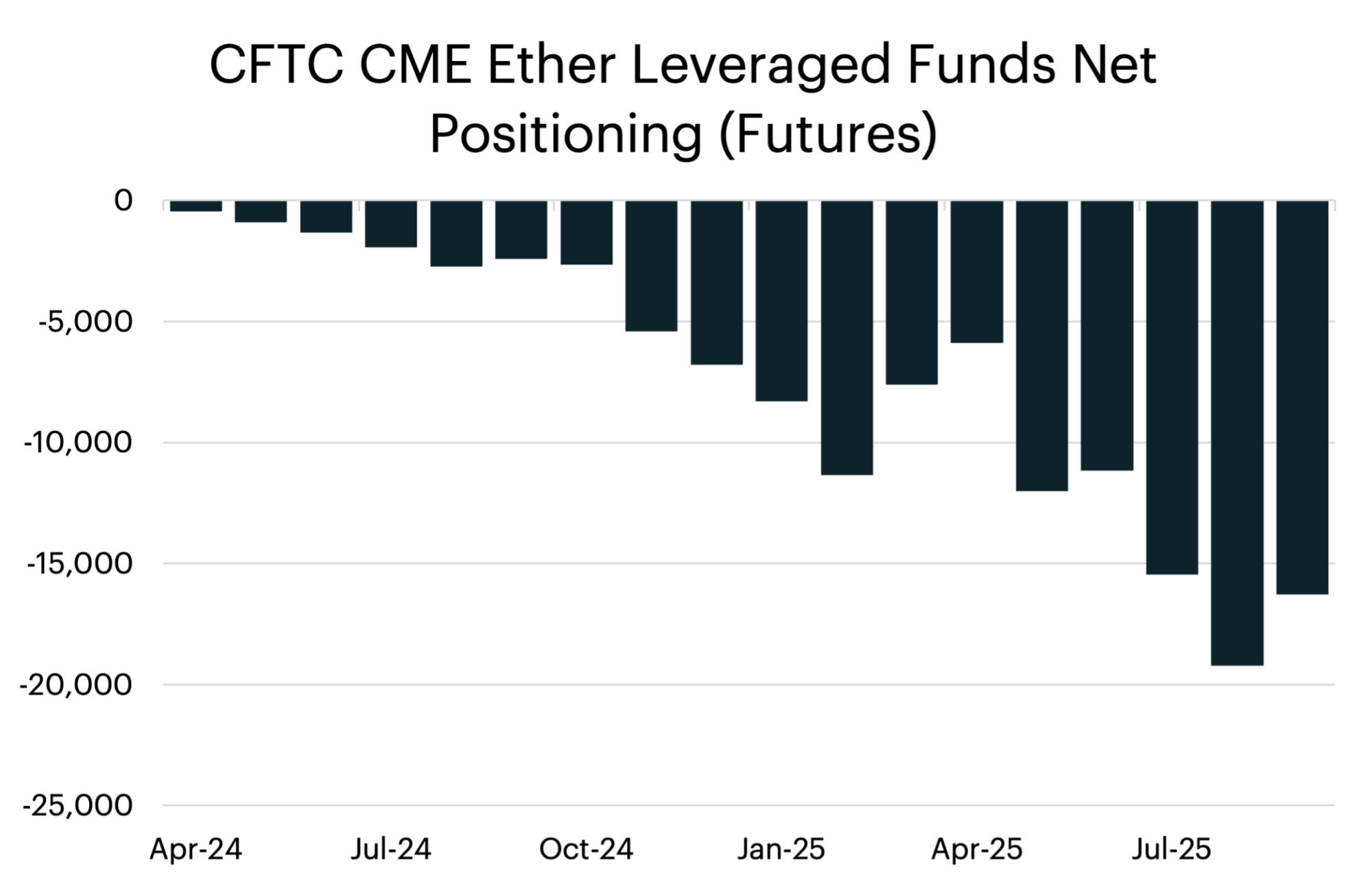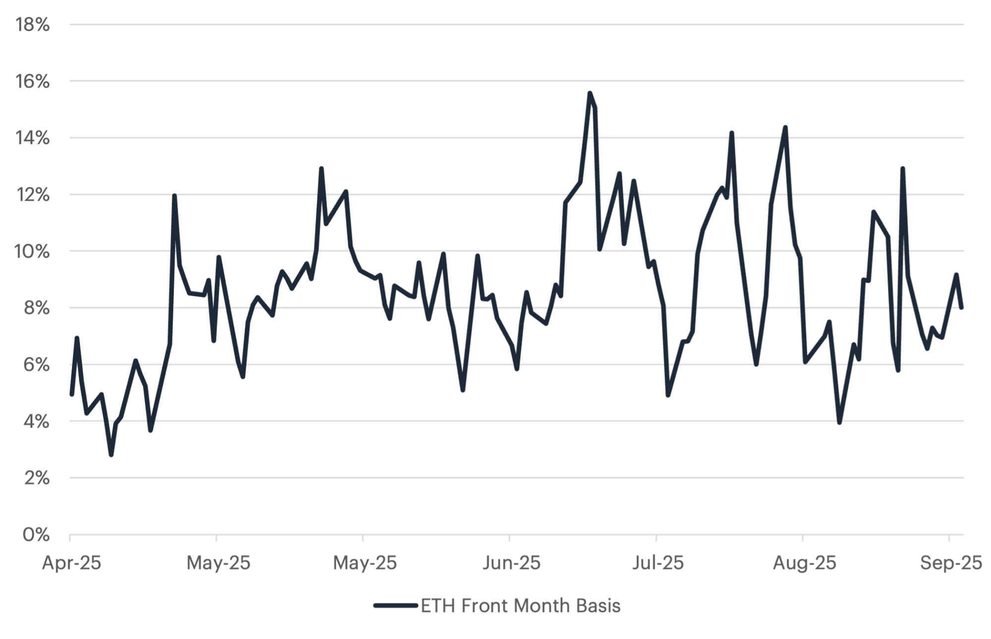 In Q2 2025, the Ether basis expanded north of 10% on multiple occasions, and we saw activity in both the spot ETF market and the futures market consistent with basis trading. Between April 2025 and August 2025, the net positioning by leveraged funds decreased from -6,000 contracts to -19,200. This coincided with roughly $11.2 billion in flows into spot Ether products over the same time period.