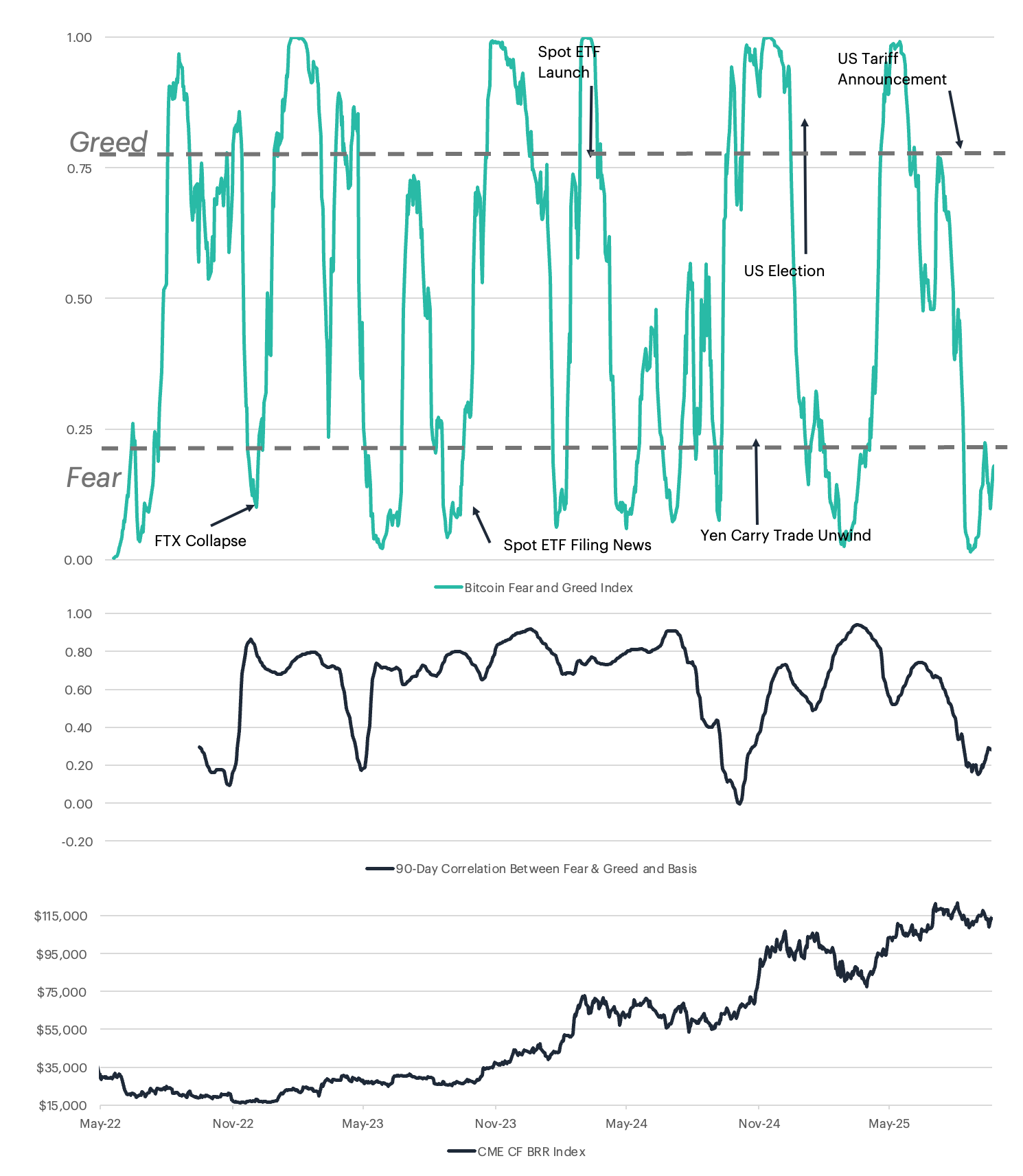 The alignment of pricing benchmarks between spot Bitcoin ETFs and CME futures contracts has created the foundation for sentiment-driven arbitrage strategies to thrive. Most U.S.-listed spot Bitcoin ETFs calculate their Net Asset Value (NAV) using the CME CF Bitcoin Reference Rate – New York Variant (BRRNY), while CME futures contracts settle against the London variant (BRR) of the same index. This shared benchmark effectively ties the regulated spot and futures markets together, ensuring that basis trades can be executed with minimal tracking error. By reducing execution risk and eliminating NAV drift, this price singularity strengthens liquidity and facilitates scalable arbitrage strategies, particularly during momentum-driven periods when sentiment extremes widen the futures premium or discount. In practice, this linkage has transformed Bitcoin's derivatives landscape, enabling traders to systematically exploit pricing dislocations while reinforcing the broader market's efficiency.
