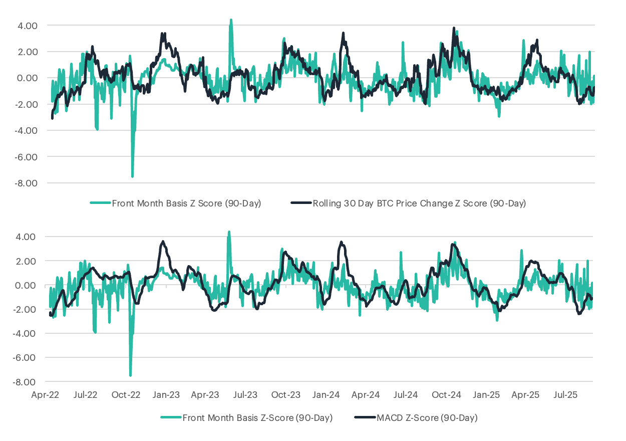 Professional traders may integrate technical indicators such as the MACD into basis trading frameworks to refine timing precision. As shown in Figure 4, combining MACD Z-scores with traditional basis signals provides a more nuanced view of market momentum shifts and potential dislocations. This approach enhances the ability to anticipate turning points while maintaining the delta-neutral structure that isolates alpha from broader market direction. Figure 4 also highlights the strong relationship between Bitcoin’s front-month futures basis (90-day Z-score) and its rolling 30-day price change (also shown as a 90-day Z-score). The persistent alignment between these metrics underscores how price momentum serves as a practical proxy for market sentiment, revealing shifts in investor positioning and conviction.