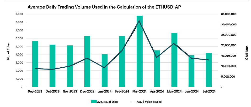 Between September 11th, 2023, and July 31st, 2024, 5,326 Ether, or $14.6 million were traded, on average, during each daily observation window. Whilst Ether trading activity typically exhibits volatility, this volatility is not substantially different from that shown by traditional asset markets. In conclusion, the volume observed at ETHUSD_AP and the reliability of that volume are clearly evident to be sufficient for the calculation of a robust and reliable benchmark.