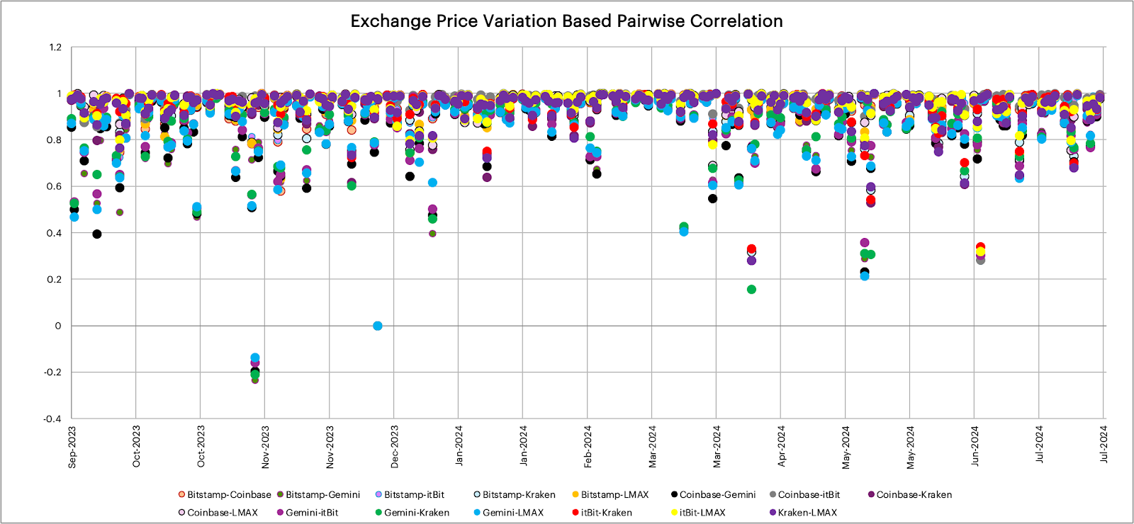 An analysis was undertaken of the pair-wise correlation of prices from Constituent Exchanges on a per-minute basis (the price difference between transactions for each minute at each exchange) during the observation period. The results of this analysis are shown in Table 2.