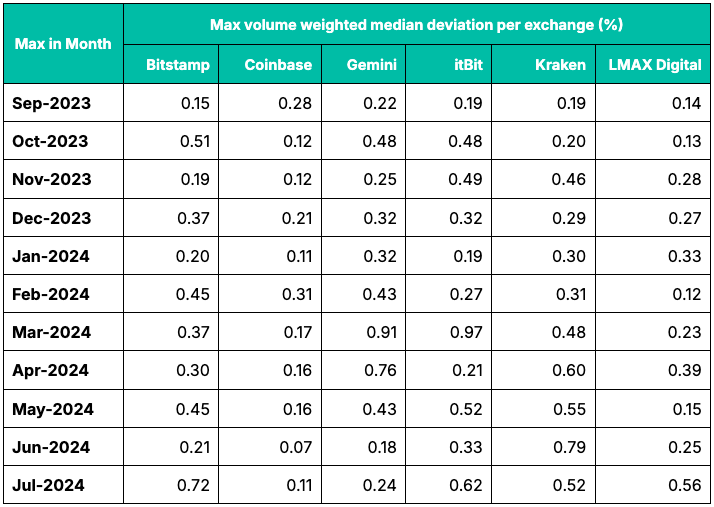 Analysis of the maximum volume-weighted median per exchange during the observation period produced the results in Table 1. These results illustrate that it was not necessary to exclude any Constituent Exchange’s input data during the observation period due to the demonstration of potential manipulation. Indeed, the data indicate that no individual cryptocurrency exchange exhibited a deviation percentage above 0.97% during this period.