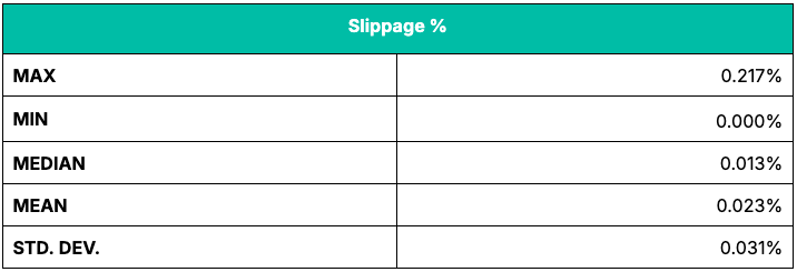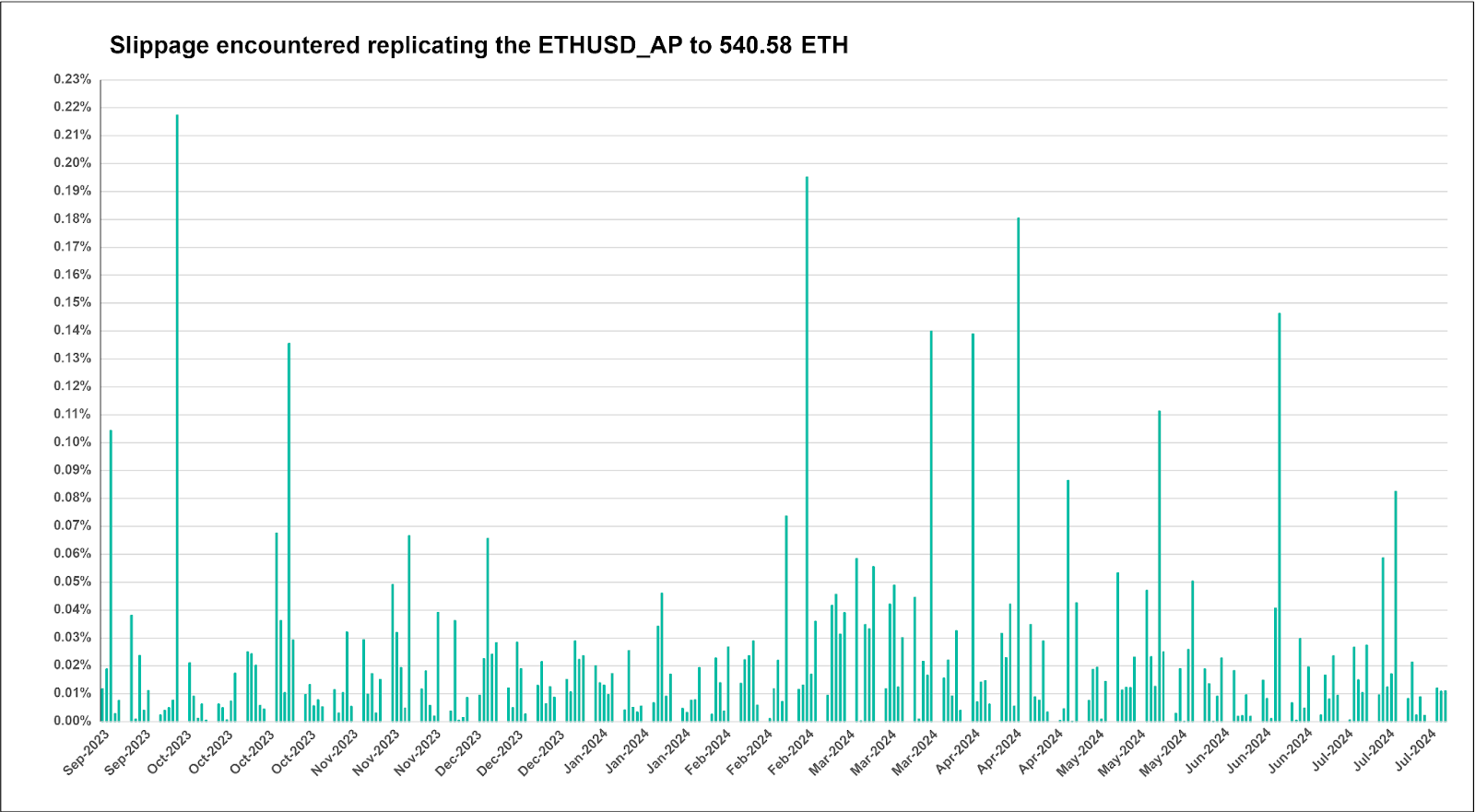 The results of this exercise are displayed in Figure 3 and summary data provided in Table 3. As can be seen, ETHUSD_AP can be replicated with a high degree of confidence, and usually with slippage of no more than 2 basis points (bps). On only 8.58% of days would slippage have been greater than 5 bps. Indeed, even on the most volatile day, slippage was only 21.7 basis points. Furthermore, in the 11-month period under observation, slippage would have been in double-digit basis points only 9 times.