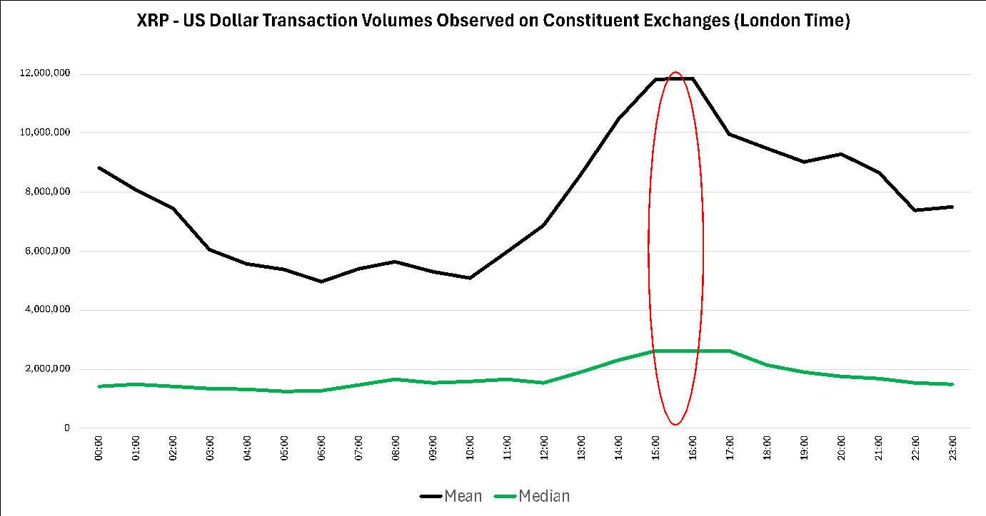 With the most liquid time of the day for XRP Constituent Exchange volumes occurring between 15:00 and 16:00 London Time, together with the traditional market close of several large European markets also being 16:00 London Time, 15:00 to 16:00 London Time appears to be the best possible one-hour window for measuring transactions of a daily benchmark XRP price.