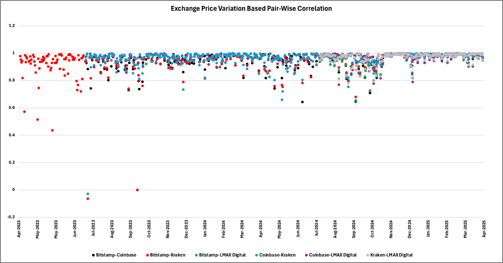 An analysis was undertaken of the pairwise correlation of prices from Constituent Exchanges on a per-minute basis (the price difference between transactions for each minute at each exchange) during the observation period. The results of this analysis are shown in Table 2.