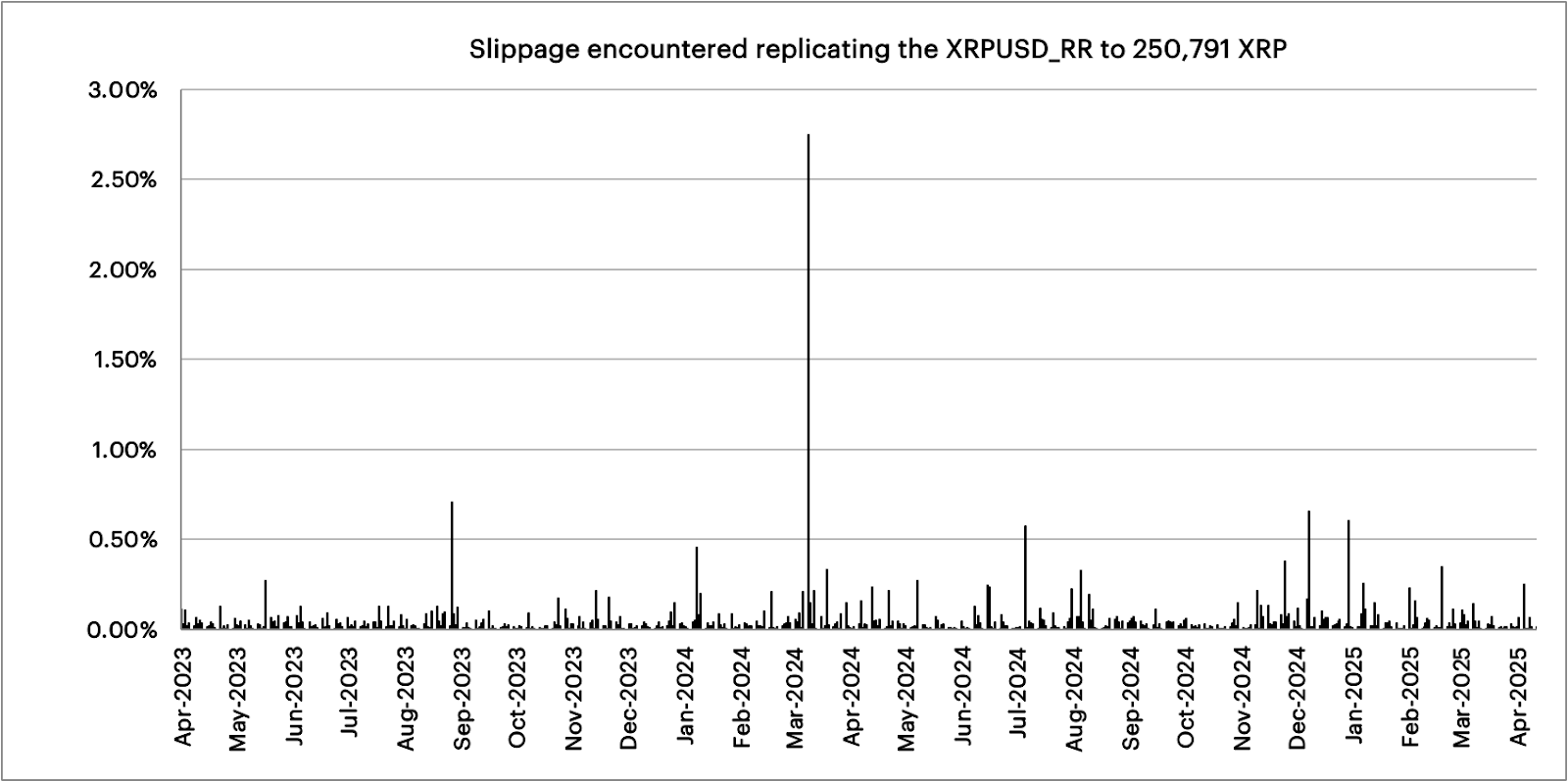 The final characteristic of XRPUSD_RR that this paper will examine with respect to its merits as a benchmark price is its replicability. In other words, that the XRPUSD_RR benchmark price can be transacted in practice on any given day without undue risk.