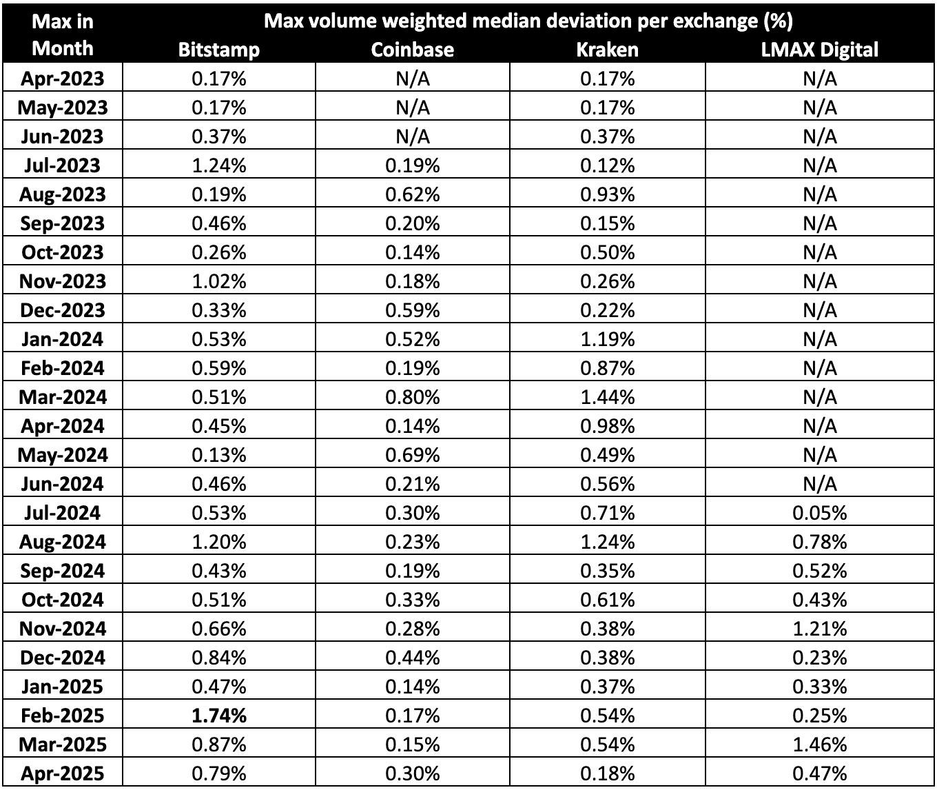 The potentially erroneous data parameter for XRPUSD_RR was not triggered at any time between April 1st, 2022, to April 30th, 2025. Analysis of the max volume-weighted median deviation per exchange during the observation period produced the results in Table 1. The results illustrate that during the observation period, no Constituent Exchange’s input data needed to be excluded due to exhibiting potential manipulation, and indeed no individual cryptocurrency exchange exhibited a deviation percentage above 1.74% during this period.