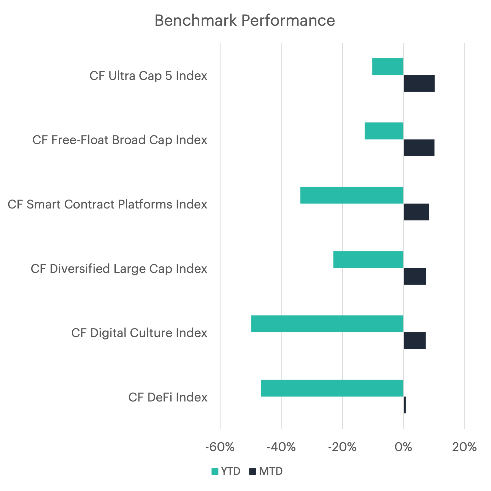 CF Benchmarks and its respective directors, officers, employees, partners or licensors do not provide investment advice and nothing accessible through CF Benchmarks, should be taken as constituting financial or investment advice or a financial promotion. Charts and graphs are provided for illustrative purposes only. Index returns shown may not represent the results of the actual trading of any assets.
