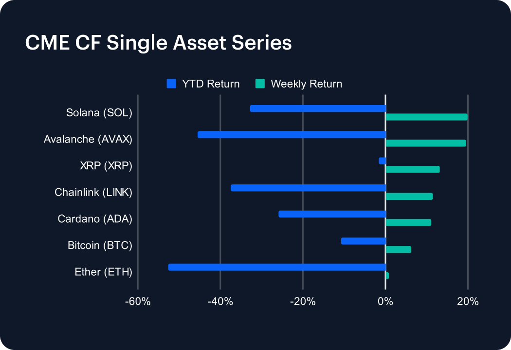 Digital assets advanced over the past week amid signs of caution. XRP rose 7.4%, outshining BTC's +5.8% and ETH's +5.5%. Volatility stabilized, with the BVXS implied vol. gauge +0.57 of a point and realized vol. +2.90. Key CF DACS averages rose, and CF BIRC funding rates were mostly steady.
