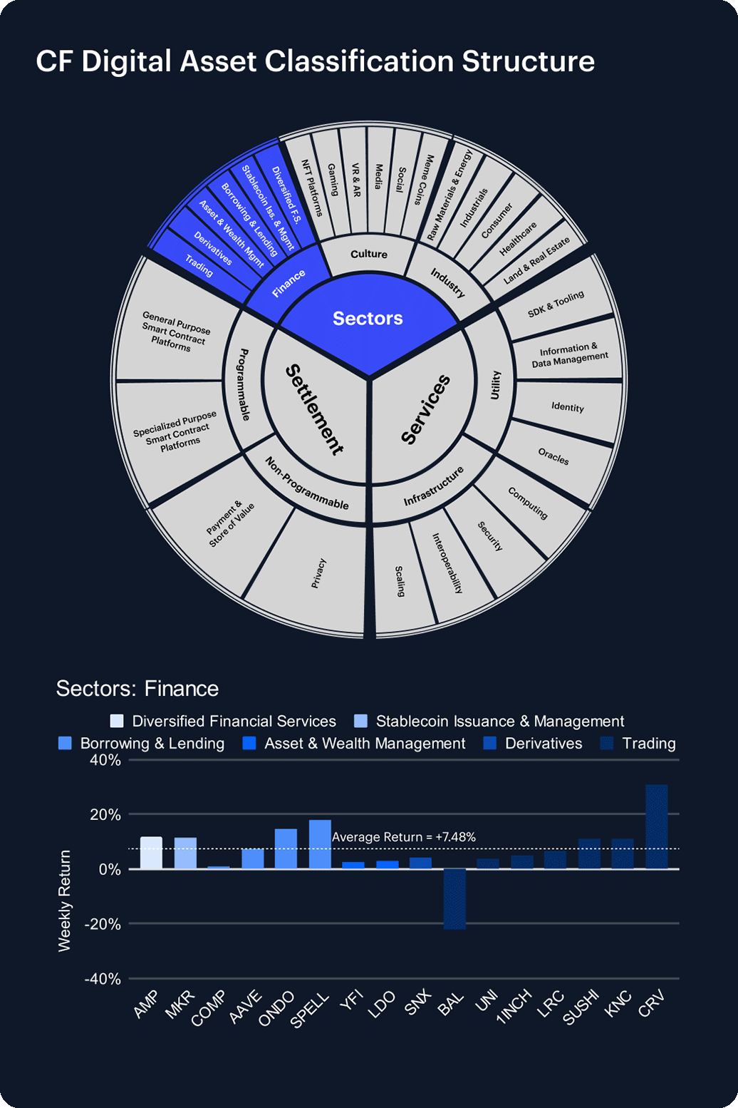 Digital assets broadly rallied this week, with standout performances across several CF DACS sub-categories. In Culture, SUPER surged 35.41%, while WIF (+33.48%) and BONK (+28.56%) led a strong rebound in Meme Coins. The Computing segment saw explosive gains, with JASMY soaring 70.24%, HNT up 46.53%, and RENDER climbing 33.11%. Among Borrowing & Lending tokens, SPELL jumped 17.84% and ONDO rose 14.84%. In the Infrastructure sub-category, STX led Scaling with a 15.78% gain, while Identity token GAL added 12.75%. On the downside, EOS (-15.47%) and XTZ (-10.75%) dragged on the General Purpose Smart Contract Platforms, and PRIME (-8.57%) was a notable laggard in the Social segment. Overall, strength was broad-based, with the computing and Meme Coin segments standing out.