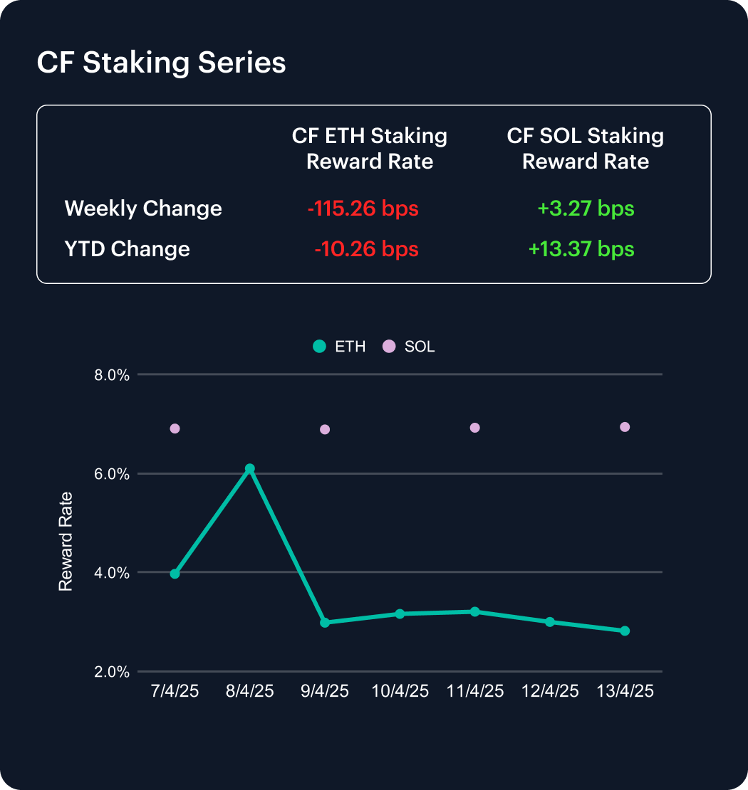 In contrast, the CF SOL Staking Reward Rate Index (SOL_SRR) rose 3.27 bps to 6.94%, marking a 0.47% weekly gain. SOL_SRR is now up 13.37 bps in 2025, delivering a 1.96% YTD increase. This divergence highlights Solana’s growing staking rewards as Ethereum’s reward environment weakens, underscoring a broader shift in staking dynamics across networks.