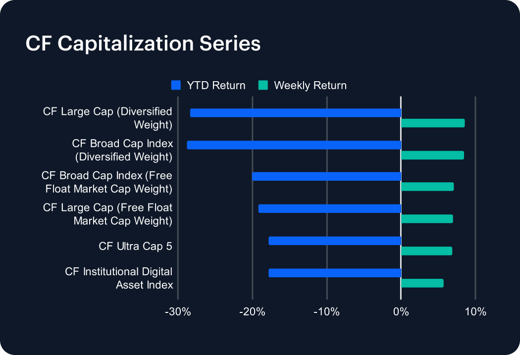 The CF Capitalization Series rebounded this week, posting solid gains across all indices. Diversified-weighted indices slightly outpaced their free-float market cap-weighted counterparts, reversing the recent trend of underperformance. The CF Large Cap Index (Diversified Weight) led the advance with an 8.62% weekly gain, trimming its year-to-date (YTD) loss to -28.37%. The CF Broad Cap Index (Diversified Weight) followed closely, rising 8.45% and easing its YTD decline to -28.80%. Among free-float market cap-weighted indices, the CF Broad Cap and CF Large Cap indices gained 7.07% and 7.02%, respectively. The CF Ultra Cap 5 advanced 6.85%, while the CF Institutional Digital Asset Index added 5.76%. The rally signals renewed risk appetite, particularly among small-cap tokens.