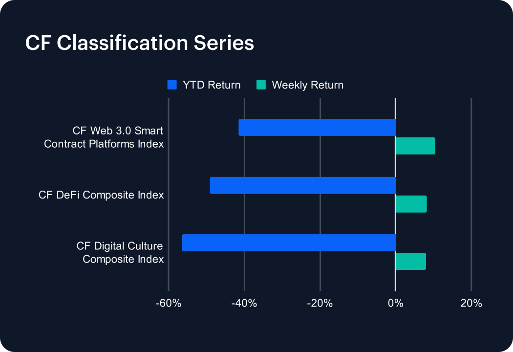 The CF Classification Series rebounded this week, as key digital asset verticals posted meaningful gains amid improving market sentiment. The CF Web 3.0 Smart Contract Platforms Index led the recovery with a 10.44% weekly gain, trimming its year-to-date (YTD) loss to -41.55%. The CF DeFi Composite Index followed, rising 8.27% and slightly reducing its YTD decline to -49.03%. Meanwhile, the CF Digital Culture Composite Index climbed 7.96%, though it remains the worst performer YTD at -56.38%. While these gains mark a positive shift, the deep cumulative losses across all three indices continue to highlight lingering investor caution around small-cap and thematic crypto segments. Broader risk appetite appears to be returning but remains selective.