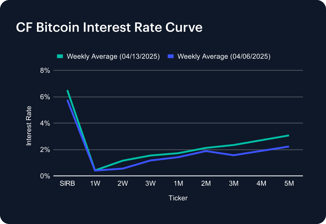 The CF Bitcoin Interest Rate Curve shifted higher across all maturities this past week, led by notable gains in medium-term borrowing costs. The Short-Term Interest Rate Benchmark (SIRB) rose to 6.50% from 5.77%, indicating renewed demand for near-term liquidity. Short-dated tenors moved up modestly, with the 1-week rate at 0.41%, the 2-week at 1.15%, and the 3-week at 1.54%. Medium-term rates saw sharper increases—4-month and 5-month tenors climbed to 2.70% and 3.07%, respectively. The broad upward shift in the curve suggests rising demand for longer-term positioning, even as funding costs tick higher across durations, pointing to improving appetite for leverage and extended exposure.