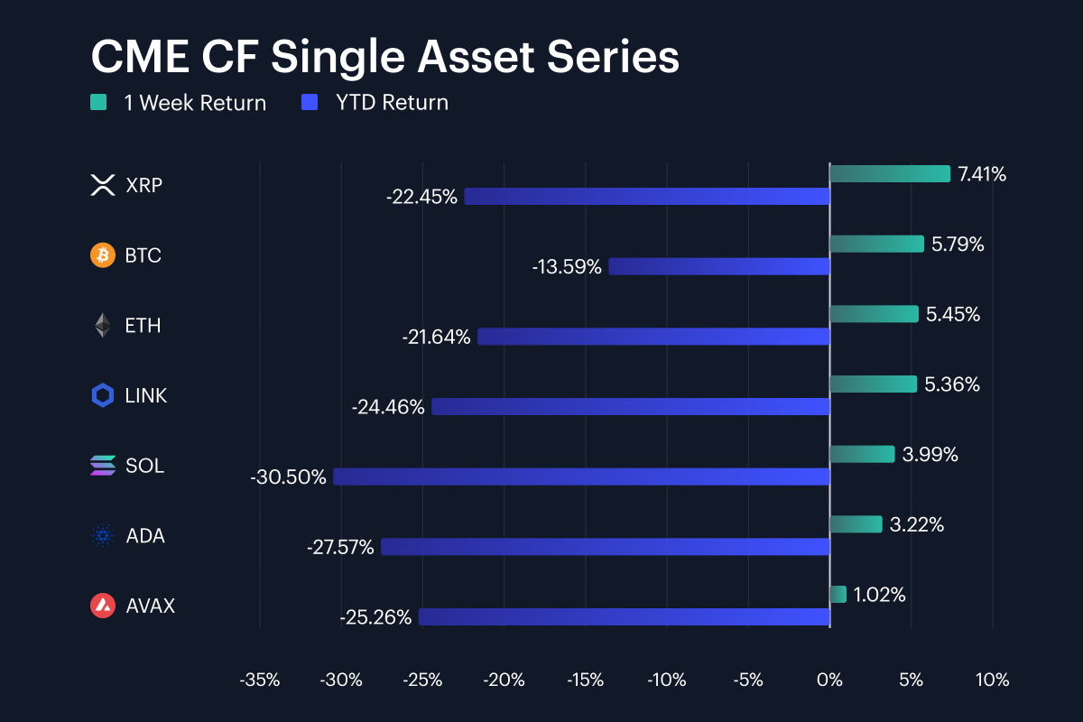 Digital assets advanced over the past week amid signs of caution. XRP rose 7.4%, outshining BTC's +5.8% and ETH's +5.5%. Volatility stabilized, with the BVXS implied vol. gauge +0.57 of a point and realized vol. +2.90. Key CF DACS averages rose, and CF BIRC funding rates were mostly steady.