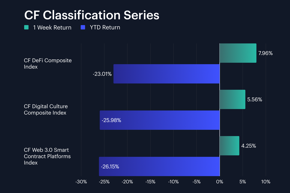 Across the CF Classification Series, the best weekly return came from the CF DeFi Composite Index at +7.96% w/w, followed by the CF Digital Culture Composite Index at +5.56% and the CF Web 3.0 Smart Contract Platforms Index at +4.25%. The spread from first to third was 3.71 pp. YTD, all three themes remain underwater, with DeFi at -23.0%, Digital Culture at -26.0% and the CF Web 3.0 Smart Contract Platforms Index at -26.2%. The week therefore brought a reopening of risk appetite inside the classification set, but the move looks selective and application-heavy: DeFi outperformed the Web 3.0 gauge by 3.71 pp, while Digital Culture still beat the platforms sleeve by 1.31 pp. Even after this week’s gains, no individual basket has recovered more than about a quarter of its YTD drawdown, with the YTD band still running from -26.2% to -23.0%. Meanwhile, Digital Culture’s 5.56% gain also sat 2.40 pp below DeFi, which keeps leadership concentrated in a single sleeve.