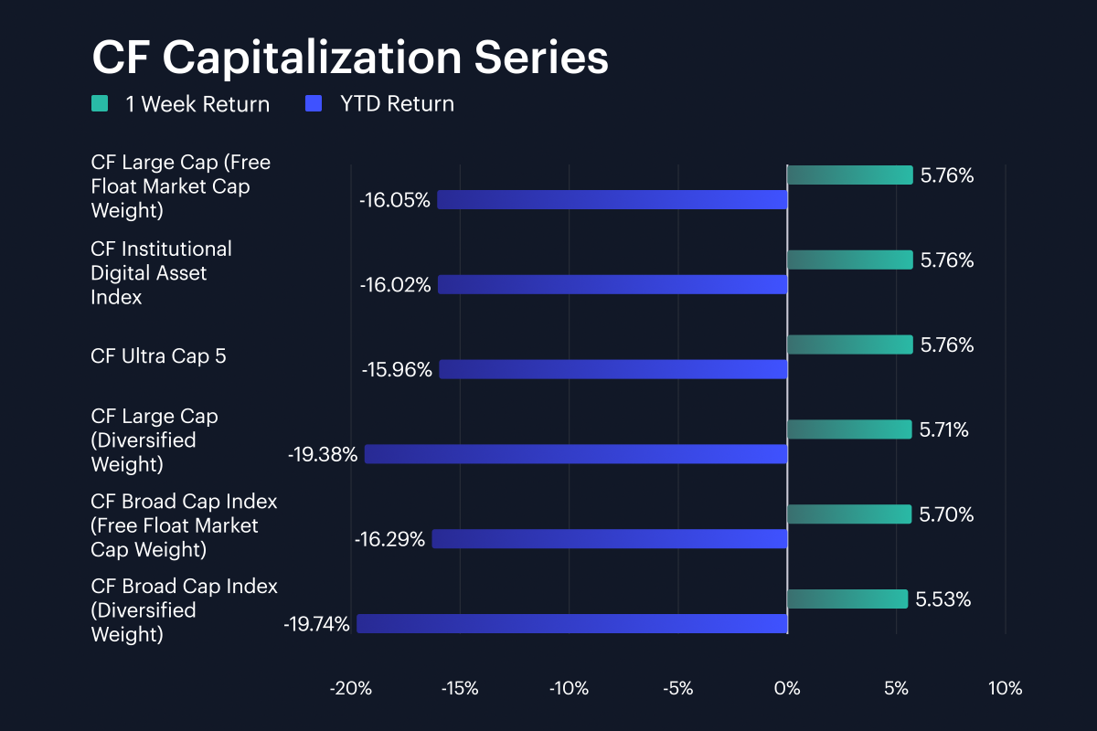 Capitalization benchmarks moved almost in lockstep. CF Ultra Cap 5 rose 5.76% w/w, CF Large Cap (Free Float Market Cap Weight) was +5.76%, and the CF Institutional Digital Asset Index also gained 5.76%. Meanwhile, CF Broad Cap Index (Free Float Market Cap Weight) returned 5.70%, while the diversified-weight large-cap and broad-cap measures gained 5.71% and 5.53%. The full six-index band was just 0.23 pp, from 5.53% to 5.76%, so the minutiae of index construction mattered less than the broad-based participation driving the rebound this week. This means the relative lag in the Broad Cap Index (Diversified Weight) was a nominal one, being only 0.23 pp behind Ultra Cap 5. YTD readings still show the damage underneath the week’s move though: the free-float indices sit at between -16.3% and -16.1% YTD, while the diversified indices are weaker at -19.7% and -19.4%. As well, Large Cap (Diversified Weight) at +5.71% for the week, sat just 0.01 pp above the free-float broad cap. The weekly cluster was therefore intact across weighting schemes on a weekly basis, with signs of relative differentiation only emerging on a look back over the year so far.