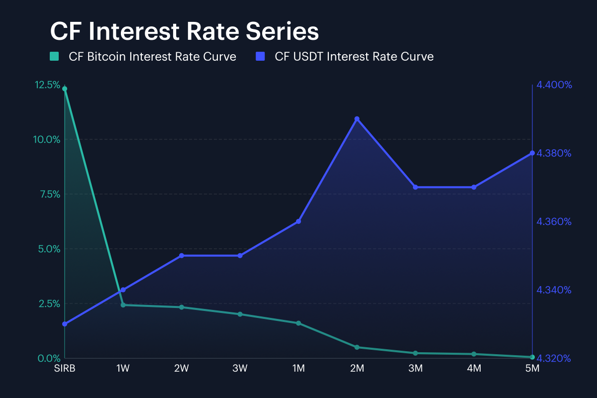 Curves moved sharply higher across our CF Bitcoin Classification Structure (CF BIRC) overall, though Bitcoin’s was uneven across tenors. Its session interest rate (SIRB) jumped from 3.67% to 12.31%, a rise of 864.25 bps, though the 1W rate fell from 2.88% to 2.43%, down 45.04 bps; then the 3M tenor moved from 0.06% to 0.23%, up 16.96 bps. Meanwhile, the USDT curve upshift was close to uniform almost point for point: USDT SIRB rose from 2.69% to 4.33%, the 1W tenor went from 2.71% to 4.34%, and 3M from 2.79% to 4.37%, changes of 163.74 bps, 162.81 bps and 158.46 bps. Across both curves, tenor-by-tenor changes ran from -45.04 bps to 864.25 bps. As such, apart from the BTC SIRB jump, the message was a firmer USDT curve and a BTC curve that steepened through the belly, with BTC 2W and 3W up 67.85 bps and 60.78 bps, even as 1W fell. USDT 2W, 3W and 1M also rose 161.72 bps, 160.63 bps and 159.17 bps, which kept the lift tightly clustered beyond the front end.