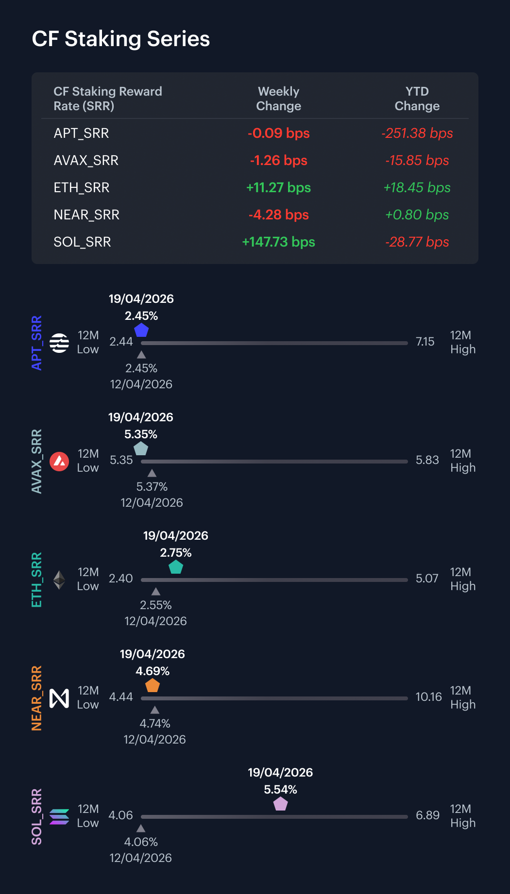 It was a relatively steady week within the CF Staking Series, though SOL was a relative outlier. Across the seven-session stretch of April 13th through April 19th, APT Staking returned -0.04% w/w, with its reward rate moving from 2.4500% to 2.4491%, a change of -0.09 bps. AVAX Staking returned -0.23% w/w, its reward rate ticking down from 5.3666% to 5.3540%, a change of -1.26 bps. ETH Staking returned 4.27% w/w, as its reward rate moved from 2.6403% to 2.7530%, a rise of 11.27 bps. NEAR Staking returned -0.90%, equating to a reward rate move from 4.7326% to 4.6898%, a change of -4.28 bps. Meanwhile SOL Staking returned 36.39% w/w. Its reward rate moved from 4.0596% to 5.5369%, a rise of 147.73 bps. Excluding SOL, the intra-week reward-rate band ran from -4.28 bps to +11.27 bps, so most of the complex stayed close to flat.