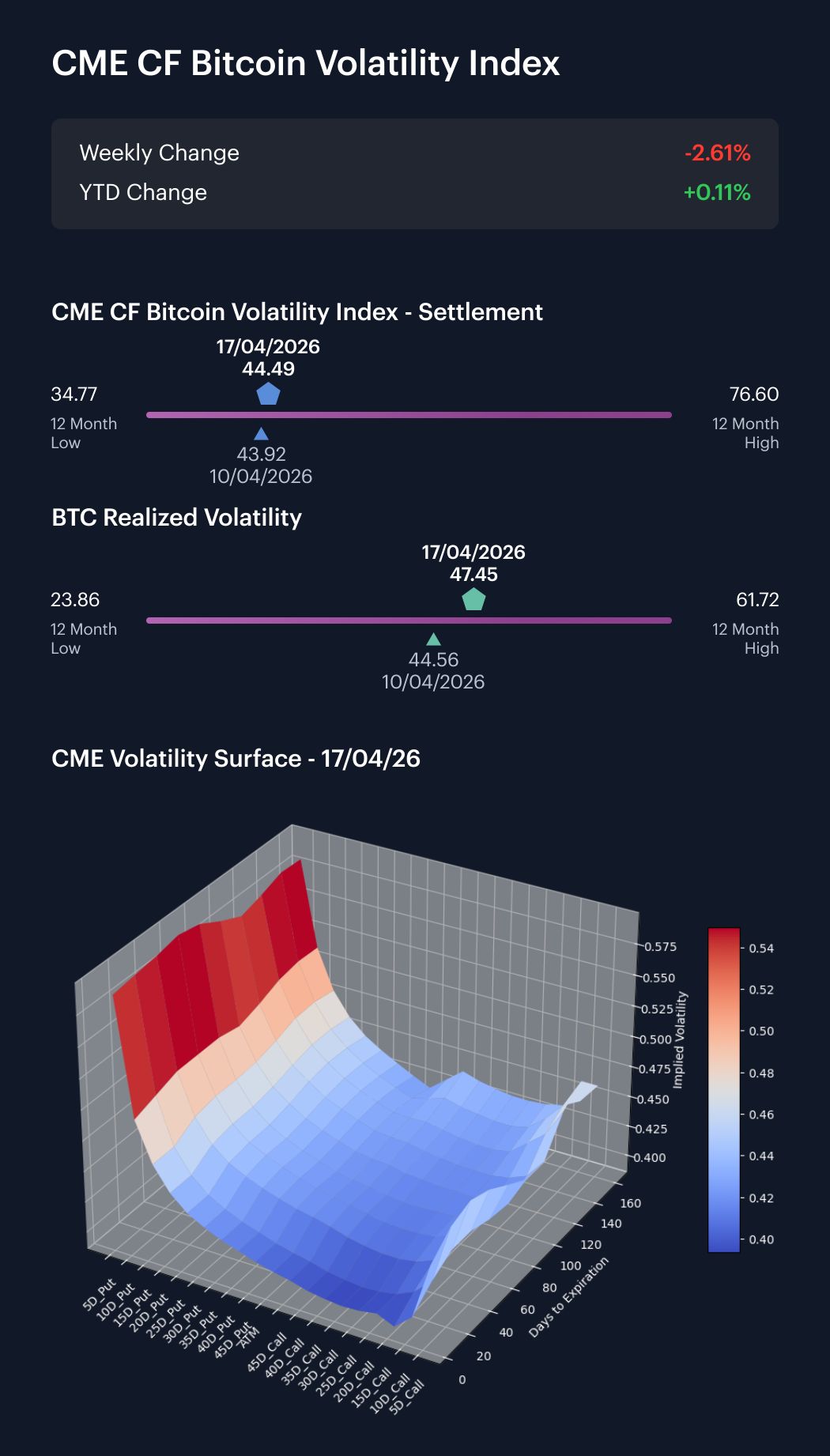 Bitcoin volatility stayed firm, though realized vol. continued to run above our implied vol. gauge. The CME CF Bitcoin Volatility Index – Settlement (BVXS) moved from approximately 43.92 on Friday, April 10th, to 44.49 on Friday, April 17th, a rise of 0.57 vol. points over the business week. Realized volatility rose faster, from around 44.56 to 47.45, a gain of about 2.90 vol. points. By the close on Friday, April 17th, realized sat some 2.96 vol. points above implied, wider than the 0.64 vol.-point gap at the start of that week. It’s worth noting BVXS’s Monday to Friday prints were 45.68, 45.21, 45.32, 44.67 and 44.49, while realized ran between 43.29 and 47.45. The surface was therefore inverted on four sessions of the five-session window, with the closing spread at -2.96 vol. points. The sign change from Monday’s +2.39 vol.-point implied premium to Friday’s -2.96 vol.-point closing spread shows how quickly delivered volatility overtook surface pricing. Likewise with Tuesday to Friday realized prints of 46.74, 46.21, 46.19 and 47.45, against BVXS at 45.21, 45.32, 44.67 and 44.49, delivered volatility ran hotter than implied for four straight sessions, underscoring that sentiment within this risk-trading market showed a tendency toward stability in the recent week.