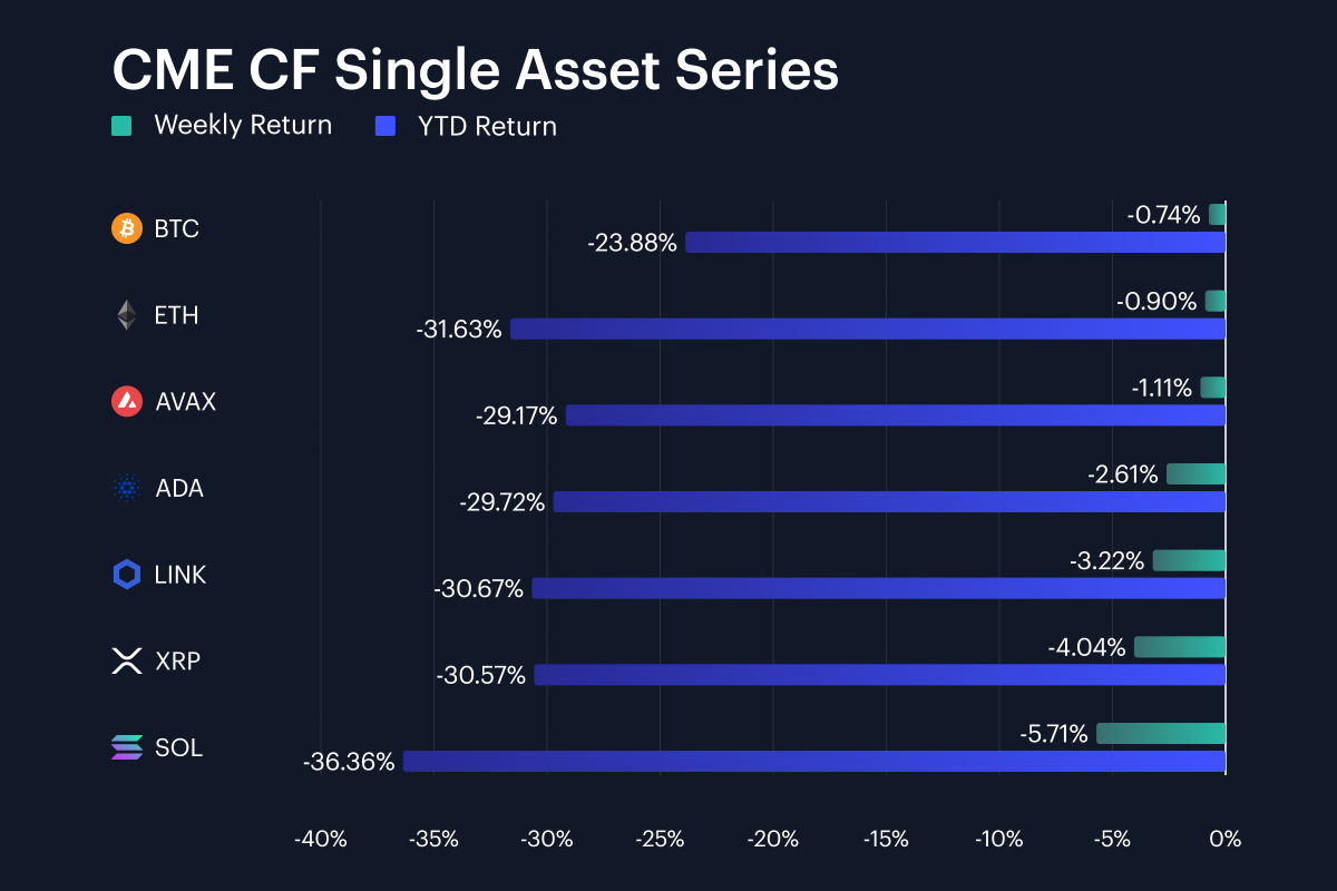 Digital assets posted a notably calmer week, with losses across the single-asset basket compressing sharply relative to the prior period. Bitcoin declined just 0.7% week-on-week (w/w) through Sunday, April 5th, a marked deceleration from the 6.2% drop the week before, bringing its year-to-date (YTD) loss to 23.9%. Ether fell 0.9% w/w, trimming its YTD drawdown to 31.6%. Solana remained the weakest major name at -5.7% w/w and -36.4% YTD, though even that represents an improvement from last week’s 10.1% decline. The single-asset basket spanned -0.7% to -5.7% on the week, a 5.0% range that is wider than last week’s 3.9% spread, driven primarily by SOL’s continued underperformance.