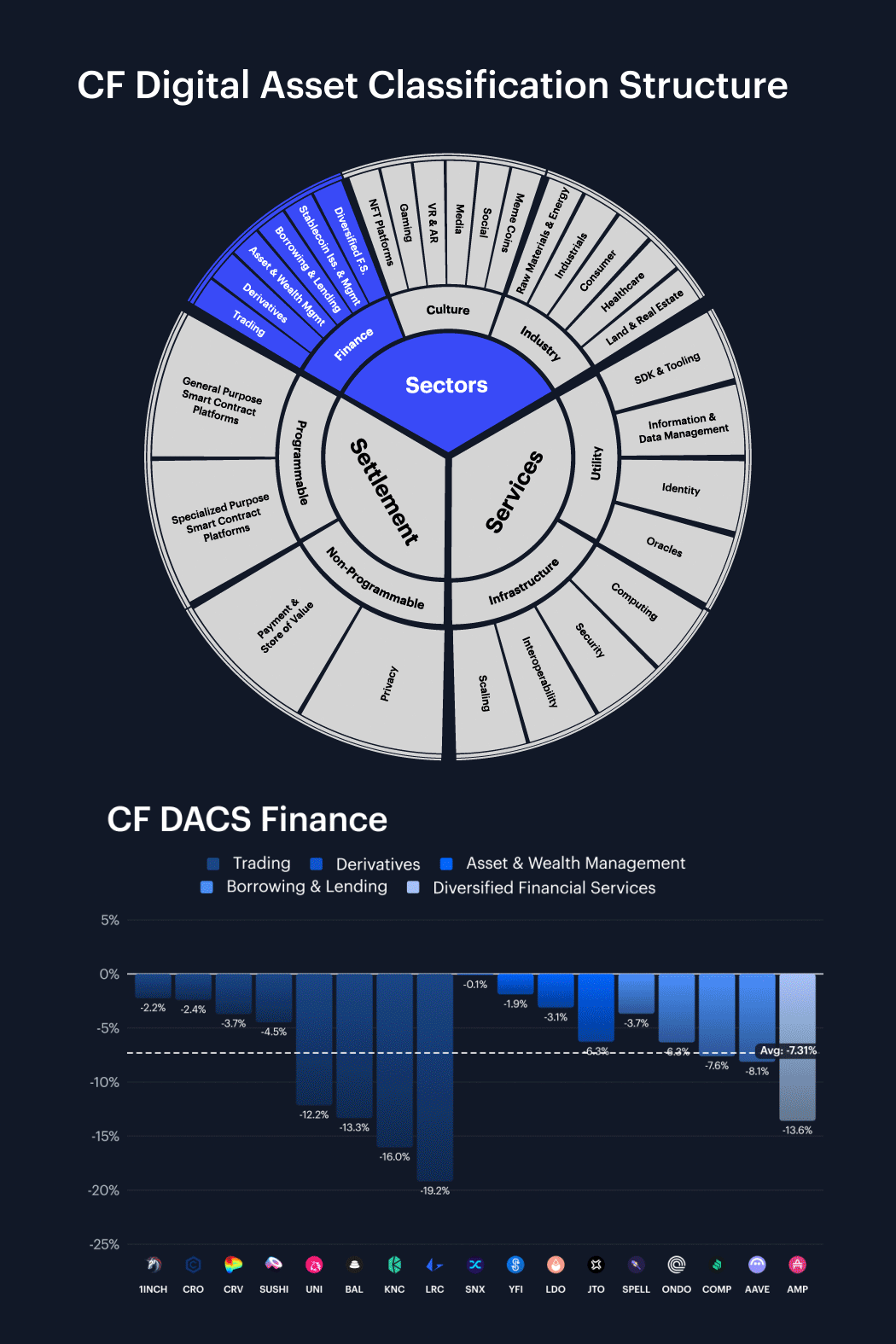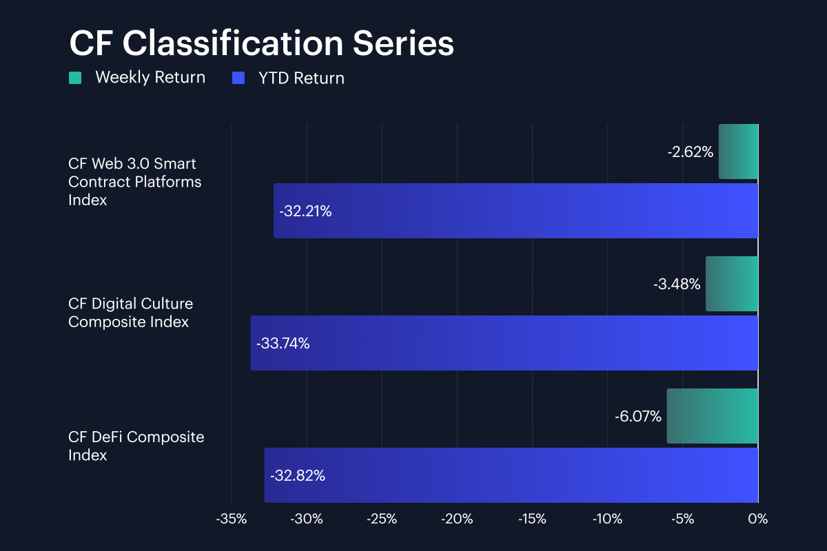 Within the CF Classification Series, the pace of losses moderated across all three thematic baskets, though the spread between best and worst widened. The CF Web 3.0 Smart Contract Platforms Index was the relative outperformer, falling just 2.6% w/w, a notable improvement from last week’s 8.8% decline, for a YTD return of -32.2%. The CF Digital Culture Composite Index lost 3.5% w/w, bringing its YTD drawdown to -33.7%, while the CF DeFi Composite Index was the weakest at -6.1% w/w and -32.8% YTD. The spread between best and worst weekly performers widened to 3.5%, compared with last week’s 1.4% gap, driven primarily by DeFi’s relative weakness. Web 3.0’s rotation from worst performer last week to best this week is the most notable shift in the complex, consistent with the broader rotation into smaller-cap and more liquid names flagged in the factor analysis. DeFi’s continued underperformance may reflect selling pressure in lending and trading protocols, where the Finance sub-sector averaged -7.3% on the week.