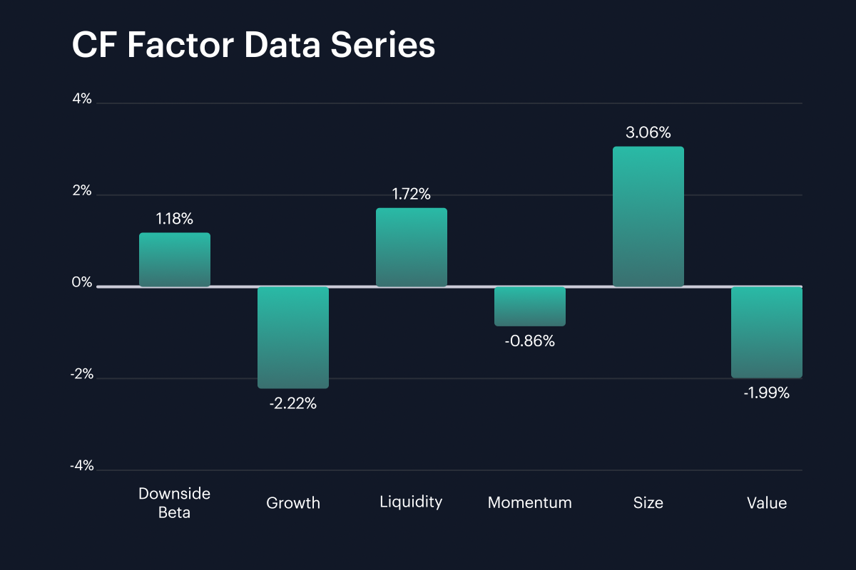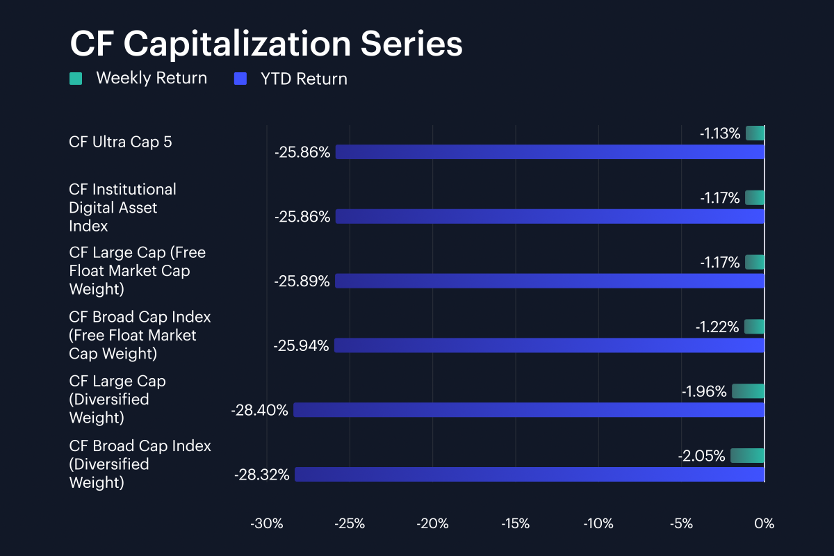 Market-cap indices posted modest losses, with the overall magnitude compressing substantially from the prior week’s -6.7% to -7.4% range. CF Ultra Cap 5 fell 1.1% w/w for a -25.9% YTD return, while the CF Large Cap and Broad Cap indices (Free Float Market Cap Weight) both declined approximately 1.2% w/w. Diversified-weight variants lagged once more: the CF Large Cap (Diversified Weight) lost 2.0% w/w, and the CF Broad Cap (Diversified Weight) also fell 2.0%, underperforming their free-float counterparts by roughly 0.8% each. The structural pattern of diversified-weight underperformance persists, though the gap narrowed from the prior week, consistent with the broader deceleration in selling pressure.